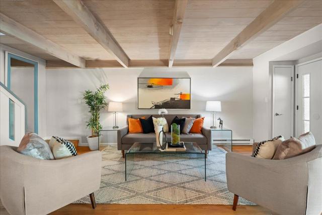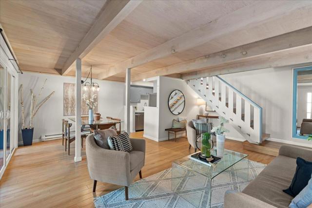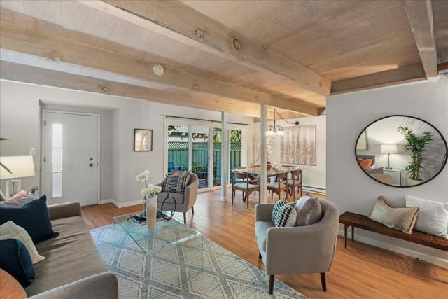 Lovely townhouse-style condo with private yard and top Los Altos schools! Prime location on the Palo Alto/Los Altos border in a walkable neighborhood near parks, shopping. Bright 2-bed, 1-bath home, wood floors throughout, vaulted wood-beamed ceilings, and updated kitchen with stainless steel appliances and tiled countertops. Primary bedroom offers two closets, ceiling fan with remote, and LED lighting. Private yard with new Trex decking, carport with storage, community pool, and on-site laundry. Minutes to San Antonio Center, Caltrain, shops, and dining.