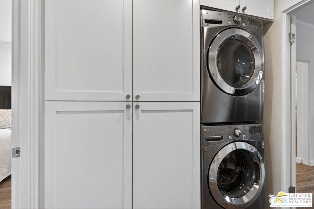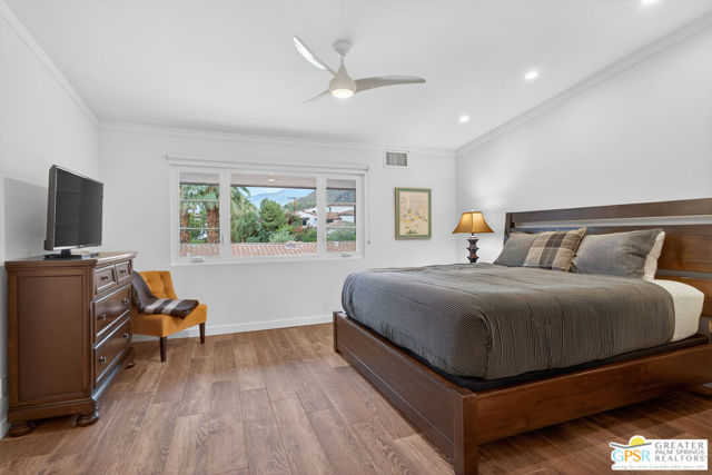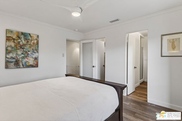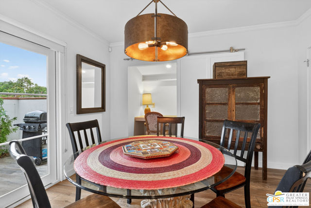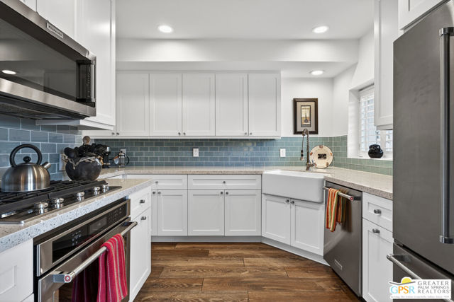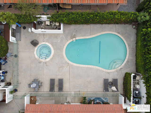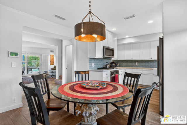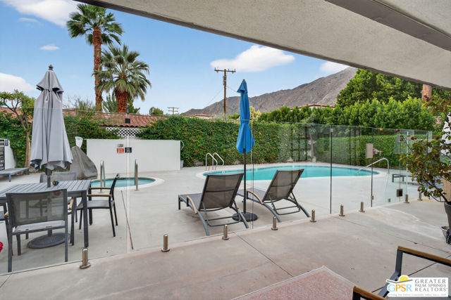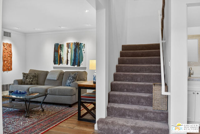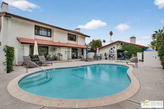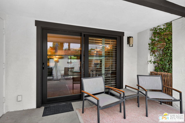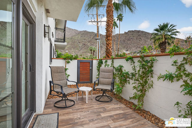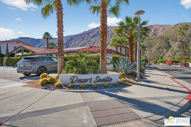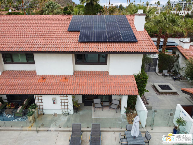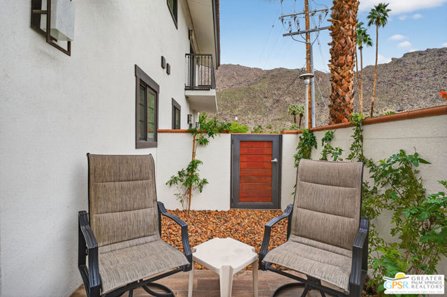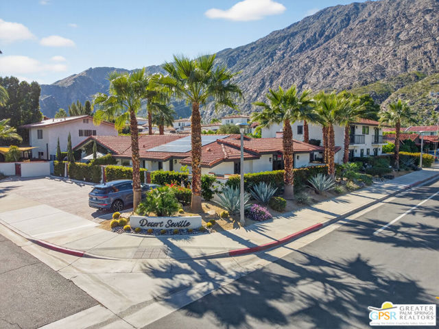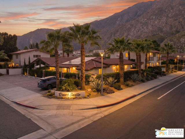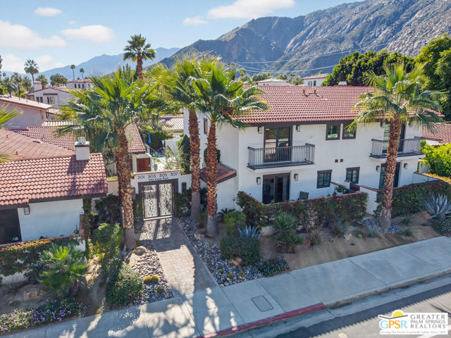 Live at the heart of Palm Springs history and lifestyle in this exceptional residence located in the iconic Historic Tennis Club neighborhood, one of the city's most prestigious, walkable, and architecturally rich enclaves. Set within Desert Seville, a gated boutique community of just four residences, this beautifully updated home offers approximately 1,592 sq. ft., two spacious primary suites, 2.5 baths, and two private patios, blending timeless Palm Springs character with modern comfort, efficiency, and thoughtful design. The flexible floor plan features dual primary bedrooms, each with walk-in closets and en-suite baths, ideal for full-time living, guests, or a refined second home. Light-filled interiors showcase Milgard doors and windows, updated interior lighting, newer tile flooring, and a stylish kitchen highlighted by a farmhouse sink, modern appliances, and coordinated hardware throughout, creating a polished, cohesive look. Beyond the square footage, the home offers several "hidden bonus" spaces that elevate everyday living, an under-the-stairs grandkids' hideaway/library/play area, plus a private office discreetly tucked behind a barn door, perfect for remote work or creative pursuits. Recent upgrades add exceptional value and peace of mind, including a high-efficiency Trane XV18 heat pump (2023), an owned Renova solar system with 14 panels, new water heater (2022), decorative front door glass insert (2024), and new stairway carpet (2025). Residents enjoy resort-style community amenities including a pool, spa, fire pit, secure gated entry, and two assigned parking spaces, all within a serene, private setting. Best of all, this unbeatable location places you just three blocks from the newly reopened Historic Plaza Theatre and moments from Palm Springs' most celebrated dining and social scene, Le Vallauris, Spencer's, Lulu, Kaiser Grille, Johannes, Pomme Frite, Sherman's Deli, Tyler's, Zin, and Johnny Costa's all an easy walk from your front door. Surrounded by iconic architecture and Hollywood legacy, the Historic Tennis Club neighborhood represents the very best of Palm Springs living. Opportunities to own in this location, especially within such a small, well-maintained community, are exceptionally rare. Historic. Walkable. Energy-efficient. Effortlessly Palm Springs.
