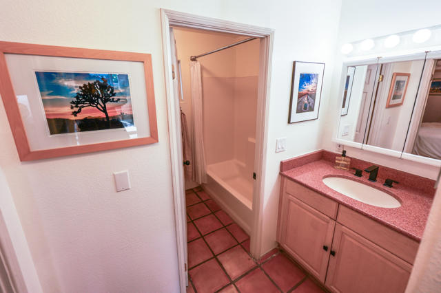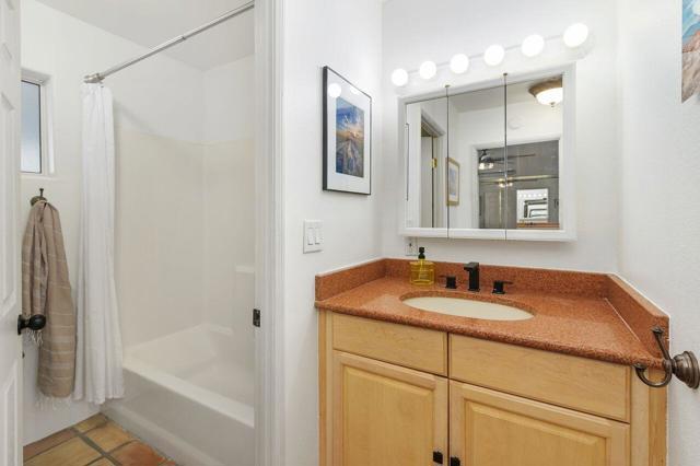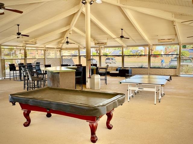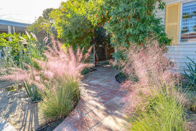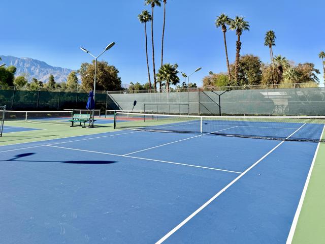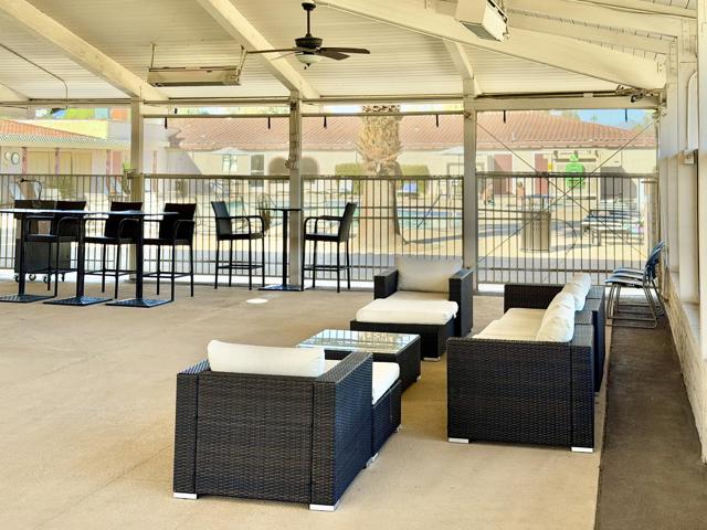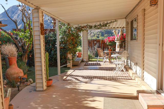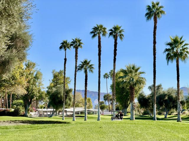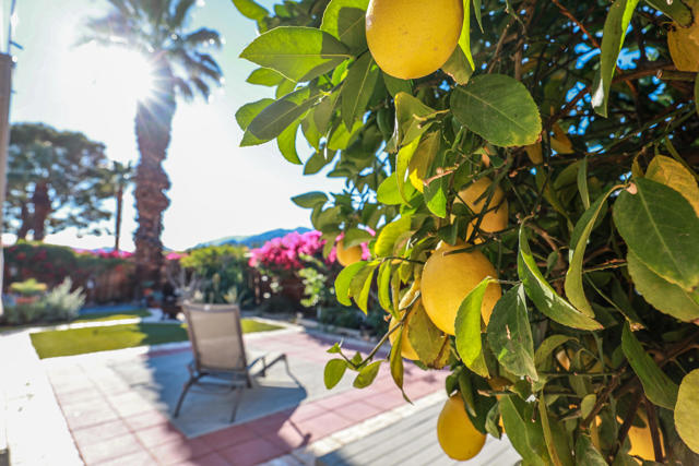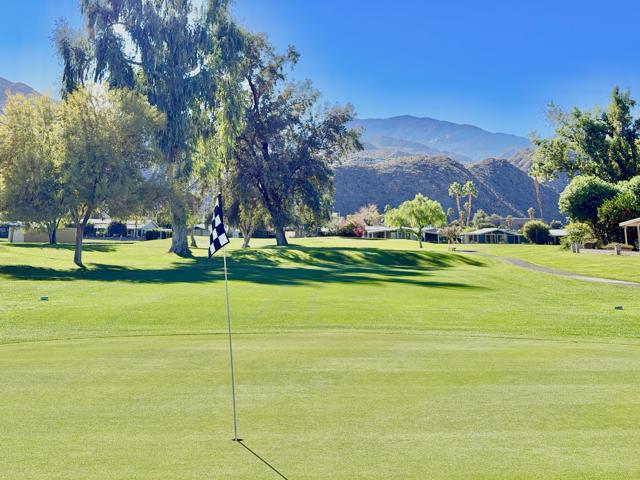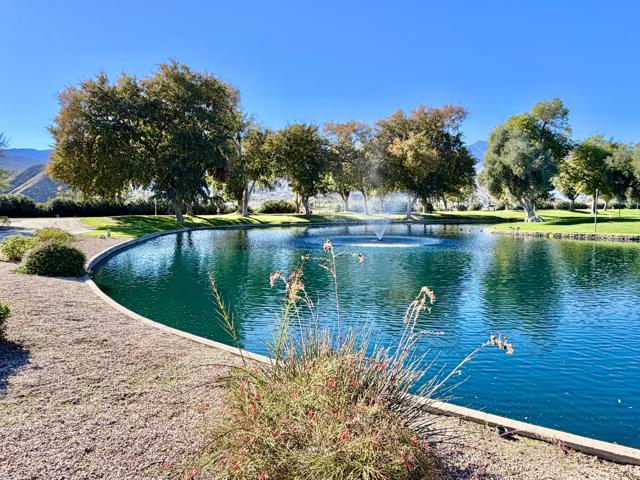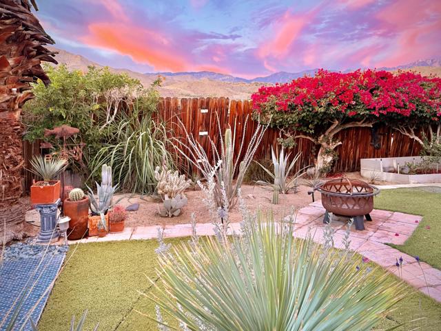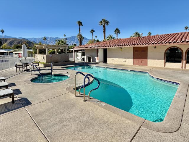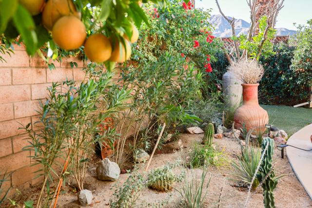 Enjoy a blissful spa experience at home at this exceptional desert haven with jaw-dropping panoramic mountain views. In a tranquil, private corner of Date Palm Country Club is a 2 bedroom, 2 bathroom home like no other. Highlighted by striking desert landscaping and lush fruit trees, the exceptionally serene back yard boasts a new hot tub/spa, an outdoor shower, and fire pit with an emphasis on privacy. Imagine waking up every morning to savor your coffee in the garden or taking a long soak in the hot tub while enjoying the sunset over the mountains. The inside is warm, spacious and inviting, upgraded with many quality materials throughout. 310 Via Don Benito features gorgeous Saltillo tile flooring, plantation shutters and efficient mini-split cooling & heating. The open kitchen has Corian countertops, a butcher block island, custom cabinets, under-cabinet lighting, and new KitchenAid appliances with air fryer. Both of the bedrooms also feature custom cabinetry to help stay neat and organized. The primary bathroom showcases a beautifully tiled walk-in shower and a Talavera hand-painted sink. New wireless ceiling fans have been installed. The patio's commercial misters can keep you cool in the summer and the standalone workshop/art studio is powered and air conditioned. The property is amply powered by a leased solar system with 38 panels. The inside electrical panel and water heater have been newly upgraded. The landscaping is watered by a drip irrigation system, managed by an advanced Smart sprinkler controller, which self-adjusts to weather conditions. Abundant storage throughout, with an additional powered shed. This warm, inclusive community caters to individuals aged 55 and older and residents have access to fantastic amenities, including a golf course, pickleball and tennis courts, pro shop, three swimming pools, gym equipment, and a restaurant.