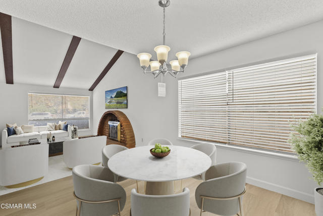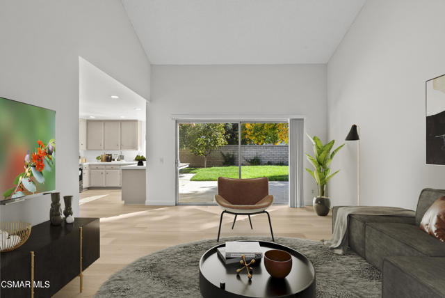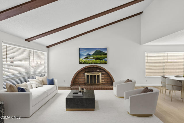 Beautifully updated 4-bedroom, 2-bath single-story home featuring vaulted ceilings, exposed beams, and a striking brick fireplace. Spacious open layout with two living areas, fresh paint, and new flooring throughout. The bright kitchen includes stainless steel appliances, ample storage, and a large window overlooking the private backyard. The primary suite offers high ceilings, mirrored closets, and patio access. Enjoy outdoor living with a patio, lush lawn, and mature trees--perfect for relaxing or entertaining. Includes indoor laundry, central A/C, and an attached 2-car garage. Located on a quiet street close to parks, schools, and shopping. Move-in ready and full of natural light! No Pets.