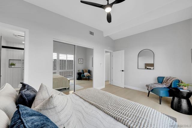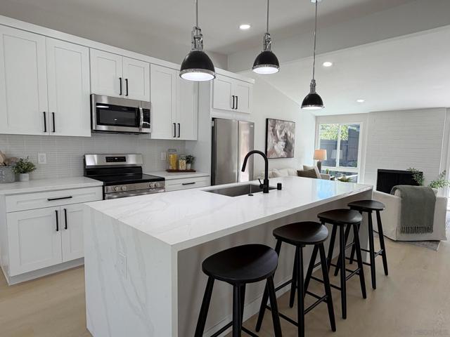 Step into this beautifully remodeled 4-bedroom, 2-bath mid-century modern home, thoughtfully updated from top to bottom. With approximately 1,500 square feet of open, light-filled living space, this home showcases vaulted ceilings and dramatic floor-to-ceiling windows overlooking a serene Japanese-inspired garden courtyard. The gourmet kitchen is a true centerpiece, featuring a large quartz island with seating for four, soft-close cabinetry, and a full suite of stainless steel appliances. Both bathrooms have been elegantly redesigned with modern vanities, expert tilework, and a combination of shower and soaking tub for ultimate comfort. Enjoy seamless indoor-outdoor living with a spacious, private backyard—complete with a covered patio, cozy firepit, and plenty of lawn space for play or relaxation. Perfectly situated in a desirable pocket of Serra Mesa, you’ll love the easy access to Mission Valley, Convoy, and major freeways. Homes of this caliber don’t come along often—come see it today before it’s gone!