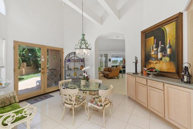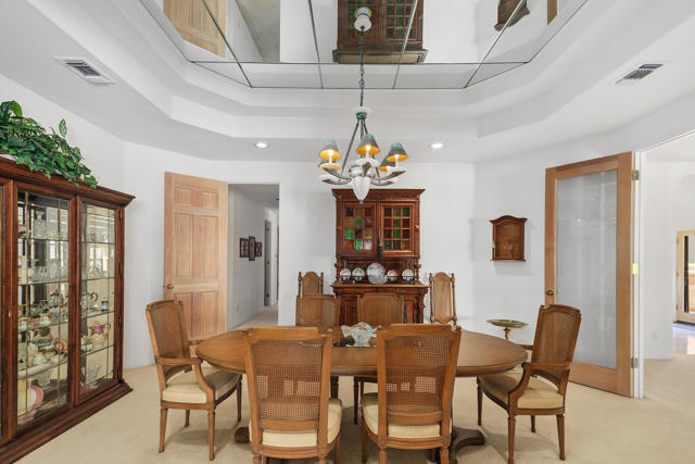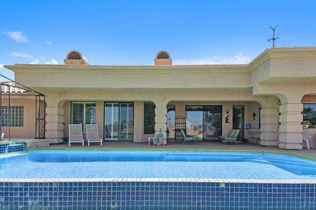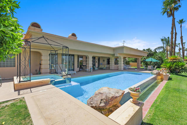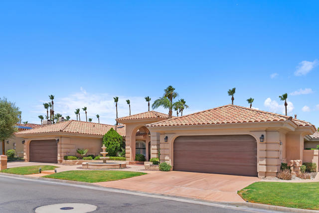 Welcome to a one-of-a-kind estate nestled in the prestigious Desert Falls Estates in Palm Desert. This custom-built home is strategically positioned on the golf course and features breathtaking panoramic mountain views. Built in 1991, this meticulously maintained residence boasts 4 spacious bedrooms, 5 luxurious bathrooms, and 5,003 square feet of architectural charm and luxury. From the grand fountain courtyard entryway to the vibrant interior spaces, every detail has been meticulously crafted with vaulted and coffered ceilings, rich architectural details, and custom-built-ins. The home features multiple living areas, each with its own fireplace, and the custom wet bar is perfect for entertaining or relaxing in style. The gourmet kitchen boasts a large island, a gas cooktop, ample cabinetry, and a sunny breakfast nook that opens to the backyard patio. The spacious primary suite is a private retreat complete with a cozy fireplace, golf course views, a spacious walk-in closet, and a spa-like bathroom featuring dual vanities, a jetted soaking tub, an oversized walk-in shower, and a cedar-lined sauna. Each guest bedroom is generously sized and well-appointed, providing comfort and privacy for family or visitors. Step outside to your private backyard oasis, where an infinity-edge pool and spa overlook the lush fairway with a striking panoramic mountain views. The large covered patio offers multiple areas for lounging, dining, and entertaining. A four-car garage is perfect for car collectors, golf cart storage, or accommodating guests with ease. Located behind the gates of Desert Falls Country Club, residents enjoy access to golf, tennis, pickleball, and a full-service clubhouse. Whether you're hosting a lively celebration or enjoying a peaceful morning with coffee and panoramic views, this home offers an unmatched lifestyle in one of Palm Desert's most desirable golf course communities.