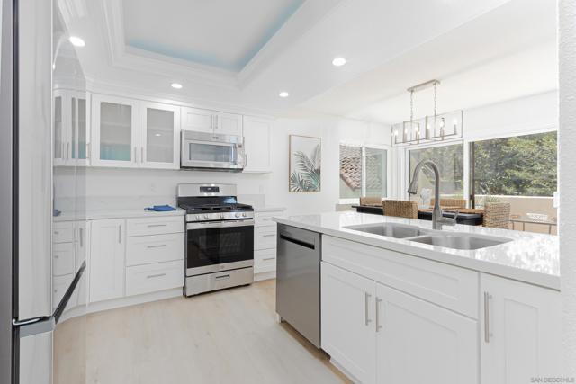 Beautifully remodeled 2-bedroom, 2-bath condo ideally located close to the community pool, tennis courts, and clubhouse. This stylish home features a modern kitchen with quartz countertops and stainless steel appliances, complemented by attractive laminate flooring throughout. The inviting living area includes a tile-faced fireplace, adding warmth and character to the space. Thoughtfully updated with contemporary finishes and modern touches throughout. ***See Supplement*** The unit features newer refrigerator, range, washer/dryer, microwave, dishwasher & garbage disposal all installed in 2024. The heater was also installed in 2024 and inspected by the city. This move-in-ready condo offers comfort, convenience, and resort-style community amenities.