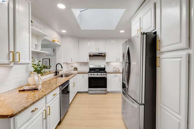 Turn-key! Experience refined single-story living in this stunningly updated 3-bedroom, 2-bath residence spanning 1,400 sqft. Thoughtfully curated with modern finishes and a sophisticated design aesthetic, this home offers a seamless blend of comfort and style. The open-concept floorplan is enhanced by new wide-plank luxury vinyl flooring and carpets, fresh interior and exterior paint and lighting that creates a warm yet contemporary ambiance throughout. The chef's kitchen features stainless steel appliances with a smart gas range, digital RO purification, and large skylight filling the space with natural light. The bathrooms have been elegantly updated with stylish finishes and attention-to-detail, delivering a spa-inspired experience. Key upgrades include new washer/dryer, energy-efficient HVAC, Ring security, app-controlled lighting and office/gym-ready garage. The outdoor features a beautiful garden with pergola, paved patio, low-maintenance turf, and a bonus private deck off the primary bedroom ready to unwind and entertain! With proximity to freeways, minutes to award-winning wineries and the eclectic downtown scene, this is a move-in ready opportunity boasting a polished, high-end feel. Enjoy all Livermore has to offer - don't miss out on this rare opportunity!