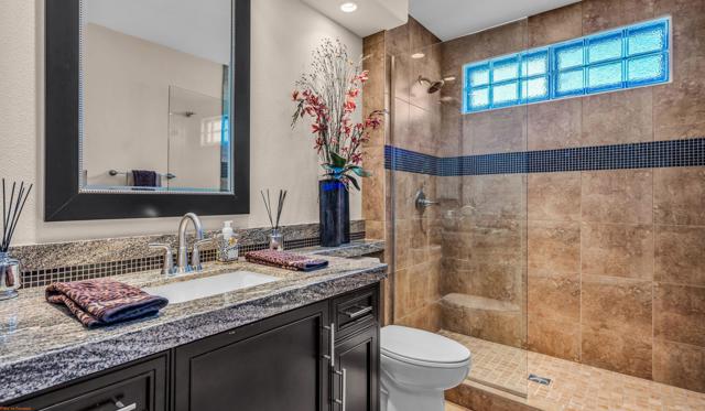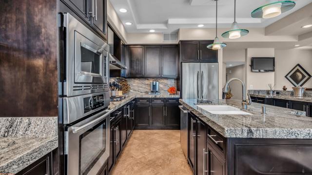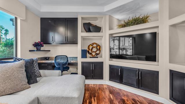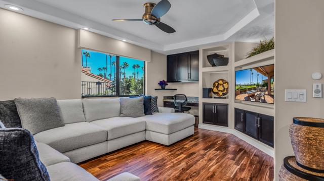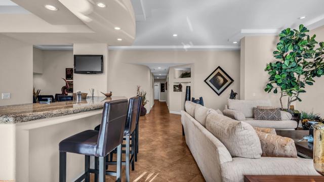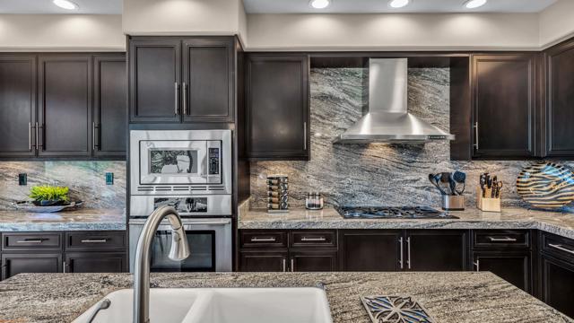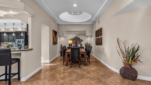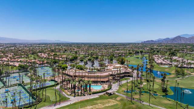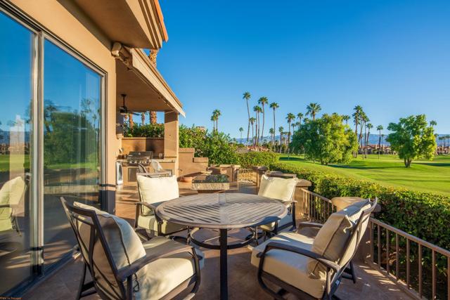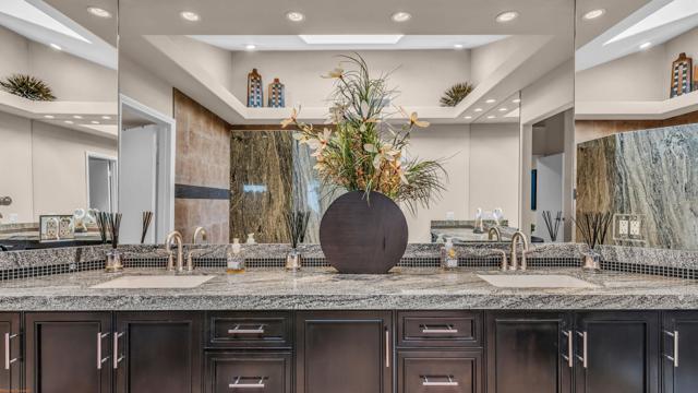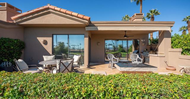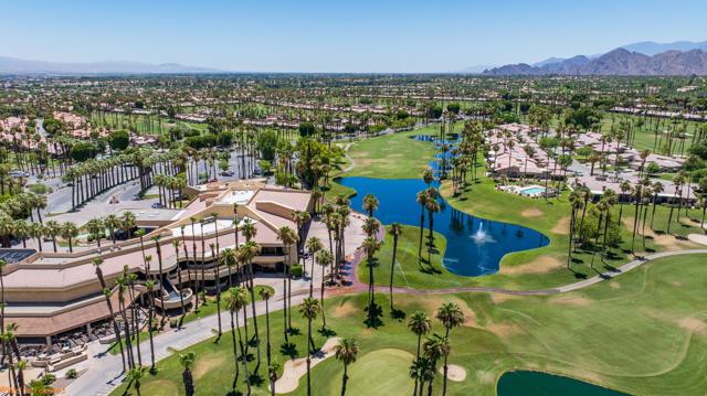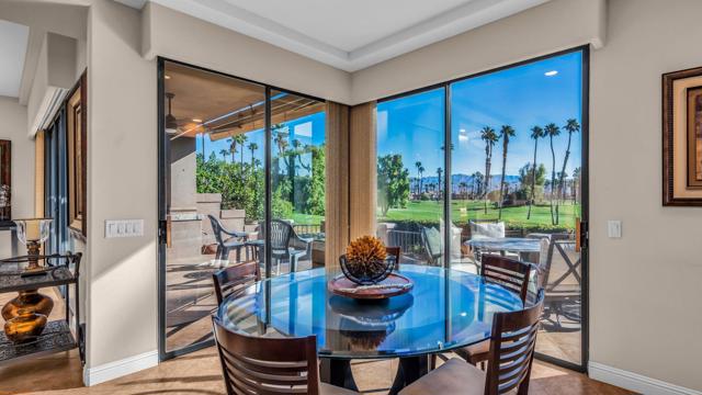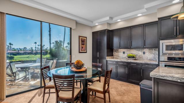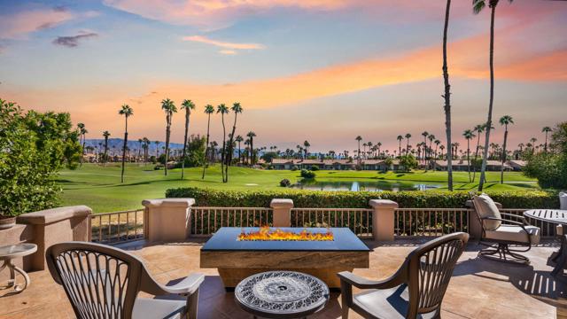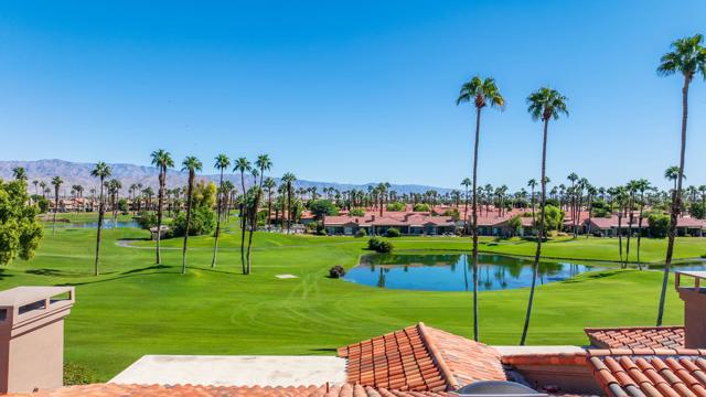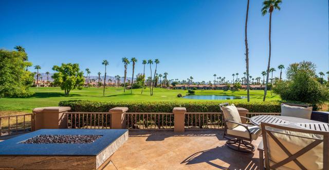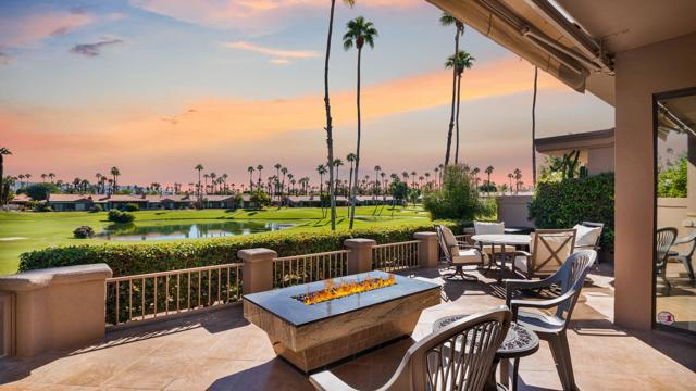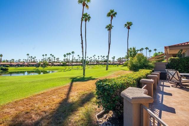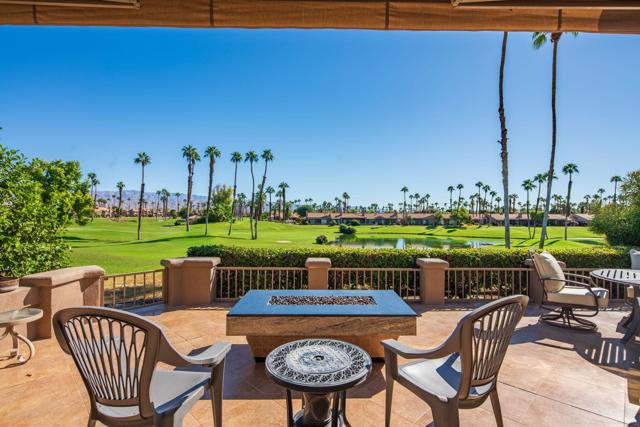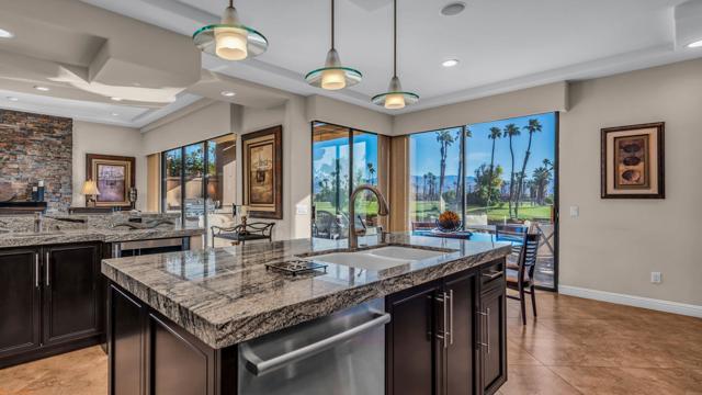 Resort style living every day in your elegant oasis home with private elevated views of the golf course and lake, adjacent pool, lush country club grounds with mountain backdrops, lagoons, and incredible scenery at every turn. This is your opportunity to enjoy a lock and leave lifestyle seasonally or all year round. This home has been lavishly updated throughout including an opening up of the gourmet kitchen to the great room. An ample breakfast counter with wet bar, kitchen island, and chef's dream appliances fulfill your culinary delights. Dine at the island counter, the dining nook with sunrise views, or the formal dining room that features a spectacular skylight. The hallmark stackstone fireplace anchors the comfortable great room, and a three panel sliding door brings the outdoors in which is a coveted part of the desert lifestyle. All bedrooms are en suite, and there is a powder room for guests. The spacious primary bedroom with vaulted ceiling is all about comfort with an en suite bathroom including large walk-in custom closet, dual vanities, a make-up area, and incredible statement tile shower. A skylight brings soft natural light to the space. The inviting guest bedroom has a vaulted ceiling, with ensuite bathroom that includes dual vanities and a tile shower. The multi-purpose den/bedroom has a polished built-in work space, and large comfortable sectional and ottoman. The adjoining ensuite bathroom has tile shower and closet. The included turnkey furnishings are luxurious - all you need is your toothbrush and you'll be ready to enjoy! The attached garage is complete with sport floor, cabinets, two car garage plus the golf cart garage, mini-split. Explore the various private membership options for Palm Valley Country Club for golf, tennis, pickleball, fitness, social activities, restaurants and bar, and more. This club is packed with active people of all ages who love the central Palm Desert location close to attractions like El Paseo, Acrisure Arena, Coachella and Stagecoach festivals, PS Airport.