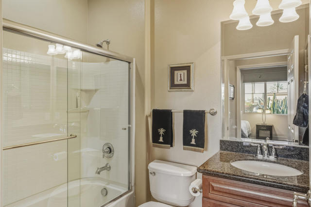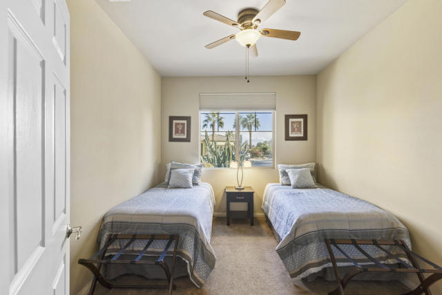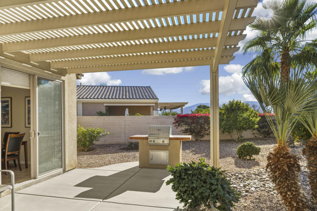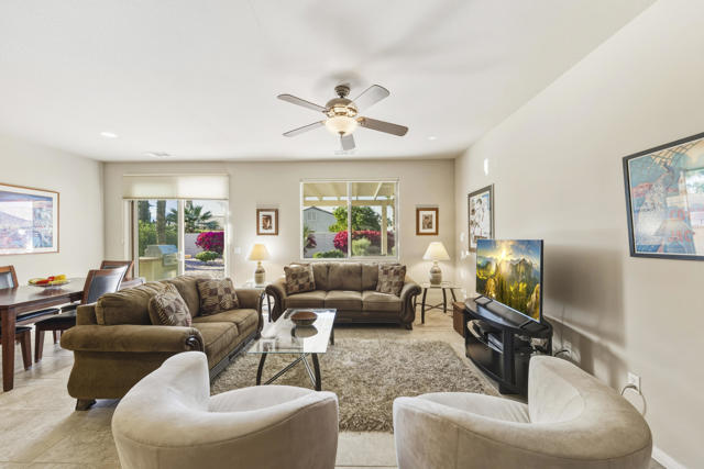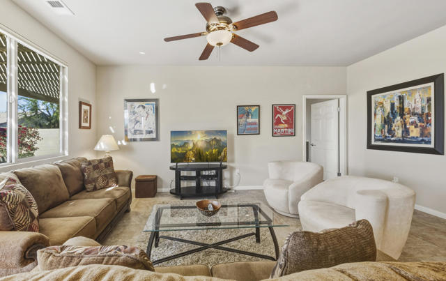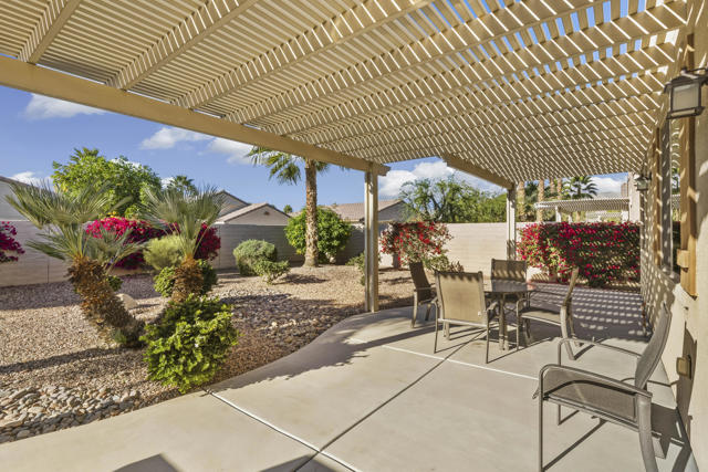 Don't miss this beautifully maintained, Turnkey Furnished, ''Cordoba'' model located on a cul-de-sac in phase 3 of Sun City Shadow Hills. This contemporary 2 bedroom and 2 bathroom home features high ceilings with ceiling fans. It has an open kitchen with granite slab counters, pull-out shelving in cabinets, stainless steel appliances, 4 burner gas stove, newer refrigerator and microwave, under cabinet lighting and a pantry. There is tile flooring throughout most of the home with quality carpeting in the bedrooms. The great room and dining area, conveniently adjacent to the kitchen, look out to the rear yard. The large primary bedroom suite has a bathroom with granite counters, dual sinks, enclosed stall shower and large walk-in closet. The guest bedroom with privacy is located away from the primary bedroom, and the guest bathroom has granite counters, tub/shower and a linen closet. There is a large laundry room with front loading washer & dryer, with stands, a deep sink and plenty of storage that lead out to the garage with a tankless water heater. Enjoy the desert lifestyle while entertaining under the custom, covered, expanded patio and built-in BBQ. The meticulously landscaped large rear yard with fruit trees has views and plenty of room for a pool too! Shadow Hills is an ''active 55+ lifestyle community'' featuring 2 golf courses, 2 fitness centers, 2 clubhouses, 2 outdoor pools/spas and one indoor pool/spa, pickleball courts, tennis courts, bocce ball courts, billiard room, a ballroom, restaurant and numerous clubs and activities! Internet is also included in the low HOA dues. Don't miss this Great opportunity!!!Home is being sold Turnkey with some exclusions...