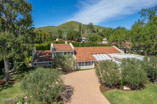 Welcome to 4011 Cresthaven Drive, a beautiful single-story California ranch estate set on a rare flat 0.48-acre lot in the heart of Westlake Village's coveted North Ranch. With 3,371 square feet of thoughtfully designed living space, this four-bedroom plus loft residence offers an extraordinary blend of warmth, character, and resort-caliber outdoor living.A beautiful interlocking paver driveway framed by mature olive trees and a three-car garage make a quiet first impression -- one that carries through the moment you step inside. Marble floors with inlaid detail, beamed ceilings, and an easy flow from the entry through the formal spaces set the stage for everything that follows.The formal living room at the front of the home is warm and inviting, with exposed wood beams and a wall of windows overlooking the manicured front grounds. The separate family room commands attention with soaring vaulted wood-beamed ceilings, a dramatic full-height brick fireplace, and direct access to the backyard. A dedicated dining room with a statement chandelier, windows, and garden views makes entertaining effortless.The chef's kitchen features custom Schuler cabinetry with pull-out shelving, granite countertops and backsplash, a built-in refrigerator, double oven, and a central island with integrated wine storage. A sun-filled breakfast nook with direct patio access completes the space and makes it the perfect spot to start the day.The primary suite is its own private wing, offering vaulted beamed ceilings, a serene fireplace, dual closets, with direct access to the backyard. The primary ensuite bathroom features custom Schuler cabinetry and is thoughtfully appointed to match the quality found throughout the home. Three additional bedrooms occupy the opposite wing, served by a shared bathroom and a hallway bathroom convenient for guests. A versatile loft with stunning wood-plank and beam ceilings rounds out the home as an inspiring office or flex space.Wood Pella windows and sliding doors are found throughout.Step outside and discover what truly sets this property apart. The resort-style backyard is an entertainer's dream, reminiscent of a Santa Barbara-inspired spa. A saltwater pebble-tec pool and separate spa anchor the outdoor space, surrounded by a thoughtfully designed brick and concrete patio with inlaid brick detail, a covered pergola ideal for al fresco dining, and lush mature landscaping including two lemon trees, a lime tree, and an orange tree. A mature privacy hedge encloses the entire rear yard, creating a sense of seclusion and privacy rarely found this close to everything Westlake Village has to offer.