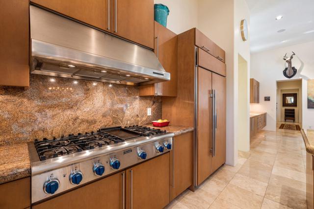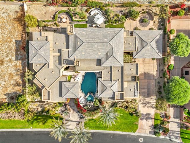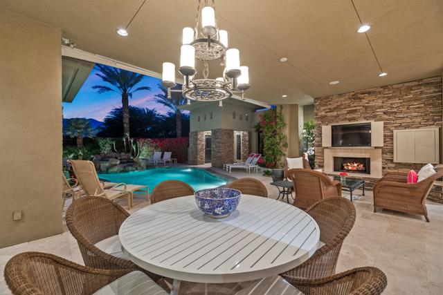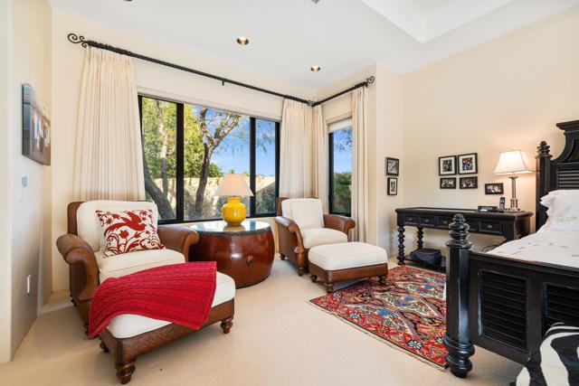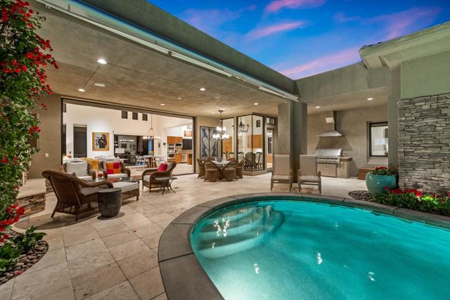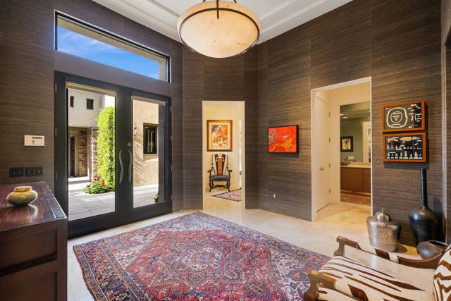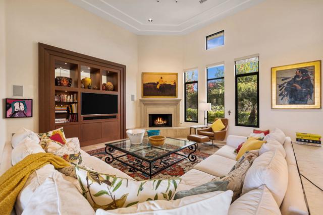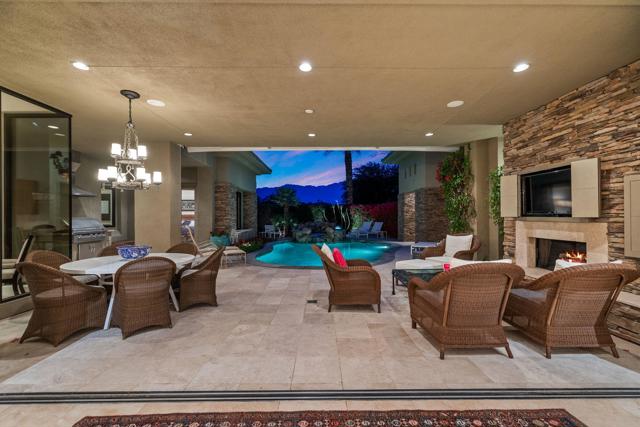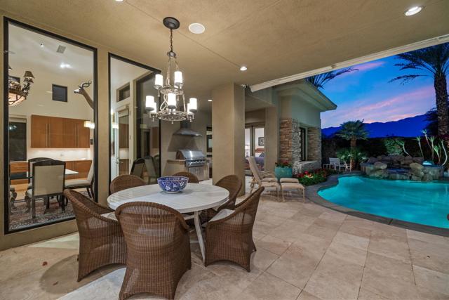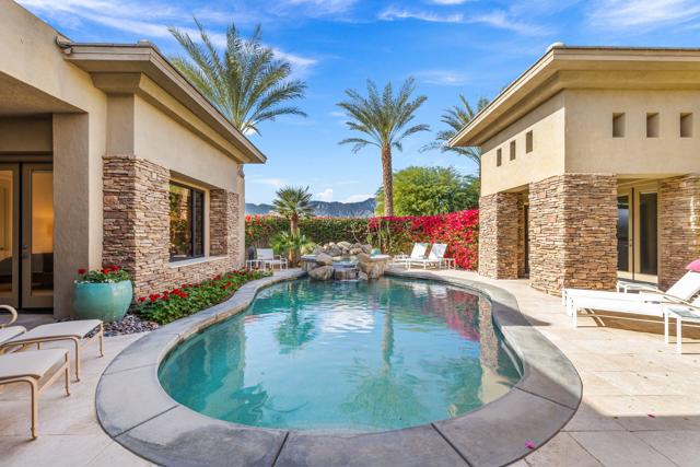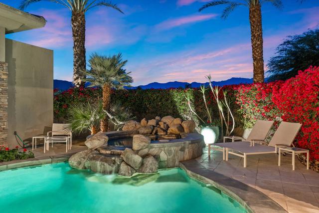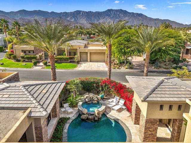 Welcome to an exquisite LIFESTYLE sanctuary nestled in the gated 40 luxury home community of Artisan in the heart of Rancho Mirage. This magnificent residence offers an unparalleled blend of sophistication and comfort on a near half-acre lot. Enter the front gate into a huge Private Courtyard providing access to the Casita and Outdoor comforts including Pool/Spa/Waterfall, Entertainment Center with Fireplace, BBQ Cooking Center and casual Dining area where you can relax and enjoy evening sunsets with an unobstructed view overlooking the San Jacinto Mountain range. Take a pathway to the front entry Foyer for access to the Great Room where floor to ceiling sliding glass wall pocket doors seamlessly integrate indoor spaces with the front Courtyard and three Backyard Patios. Great Room includes a full wall Entertainment Center, Fireplace, chef's Kitchen featuring upgraded cabinets, appliances, large casual eating area and Island with breakfast bar. An elegant formal dining room perfect for hosting lavish dinner parties completes the Great room. This home boasts five generously sized bedrooms including the Casita all with private bathroom ensuites thoughtfully designed to provide the utmost in privacy, relaxation and individual unique charm plus a Guest Powder room. Amenities include travertine floors throughout, carpeted bedrooms, three bay garage and professionally landscaped. Close to The River, El Paseo, Zoo, Golf, Casinos, Acrisure Arena and Palm Springs Int'l Airport.