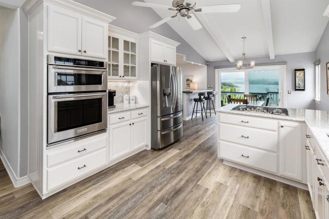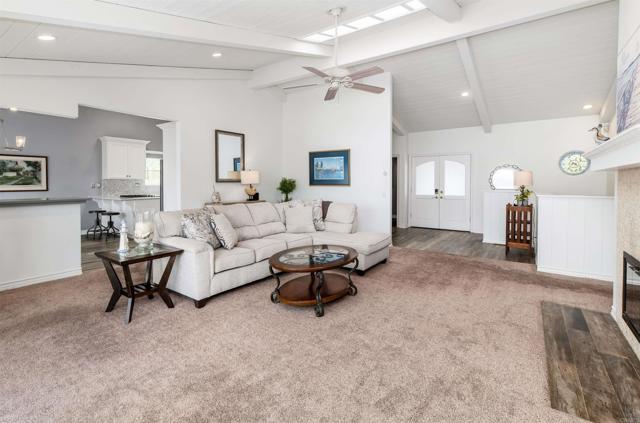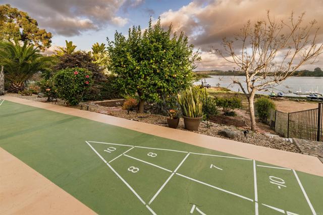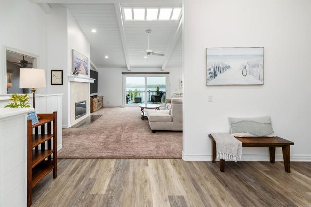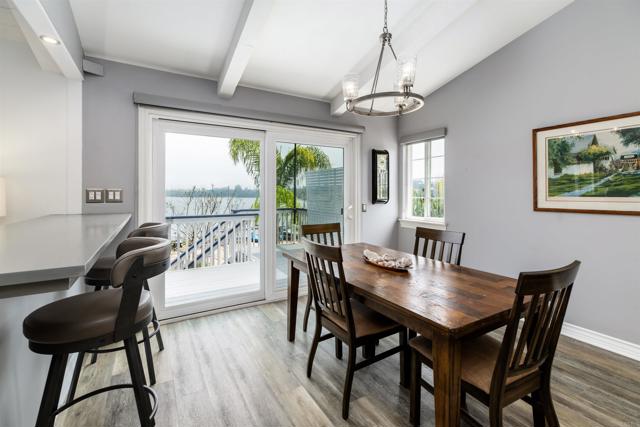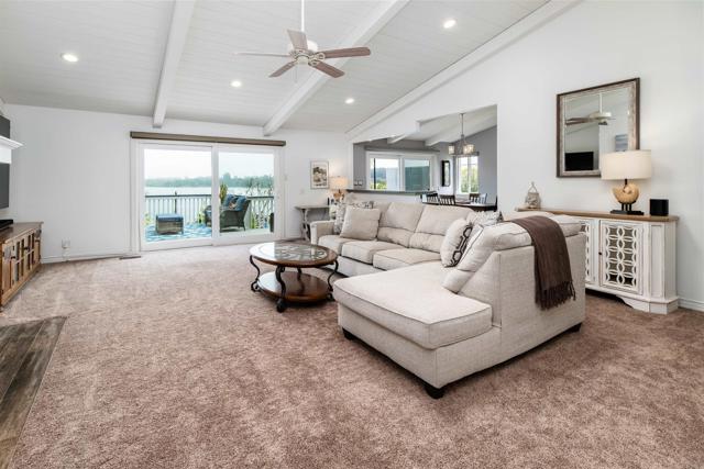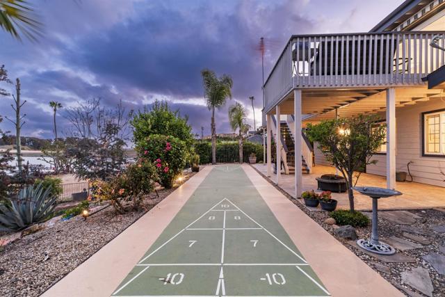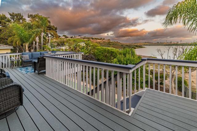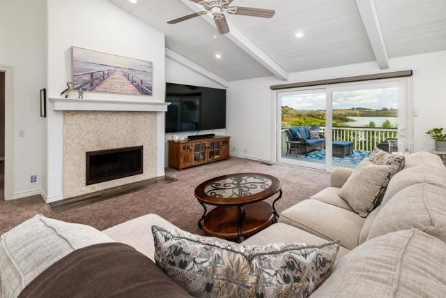 An amazing opportunity for an Airbnb or VRBO investment—or simply your own private waterfront retreat—this rarely available Carlsbad home is tucked away at the very end of a private drive shared with just one other home. This home opens up to sweeping, panoramic views of the Agua Hedionda Lagoon stretching all the way to the Pacific. Set on a nearly 20,000 sq ft lot, it offers exceptional privacy, breathtaking vistas from nearly every room, and direct access to the water—where kayaking, wakeboarding, and unforgettable sunsets can be part of everyday life. The flexible floor plan lives like a single story, with the primary suite located on the main level. Double front doors open to sweeping water views that immediately draw your eye across the open-concept living space. Vaulted wood-beamed ceilings and a stone fireplace add warmth and charm, while oversized sliders lead to a wraparound deck that stretches along the lagoon-facing side of the home—creating a seamless indoor/outdoor connection. The adjacent dining area with a second set of sliding glass doors, flows easily into a modern kitchen outfitted with quartz countertops, SS appliances, and a walk-in pantry. With natural light pouring in, the layout makes everything—from daily routines to entertaining—feel bright, open, and effortless. The main-level primary suite is peaceful and light-filled, with vaulted ceilings, large picture windows, and a beautifully refreshed ensuite featuring a walk-in shower, dual sinks, a vanity area, and a spacious walk-in closet. Downstairs, three guest bedrooms share a full bath and connect to a large, lounge-style living area with direct backyard access—perfect for game nights, movie marathons, or relaxed gatherings. A separate bonus room with custom built-ins adds extra flexibility, whether you need creative space or extra storage. Outside, the backyard is designed to take full advantage of the setting. A spacious stamped concrete patio offers plenty of room to relax or dine outdoors, while a built-in shuffleboard court brings a playful touch. Meandering garden paths wind through native plants, colorful blooms, and mature trees, gently guiding you toward the water’s edge—all framed by breathtaking sunset skies. With no HOA, a solar agreement already in place, and a location just minutes from Carlsbad Village, local beaches, and I-5, this is more than just a home—it’s a lifestyle. A rare chance to own a true waterfront retreat, where every day feels like a breath of fresh air.