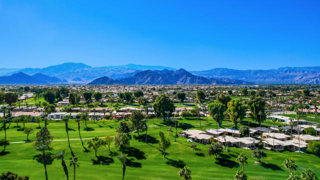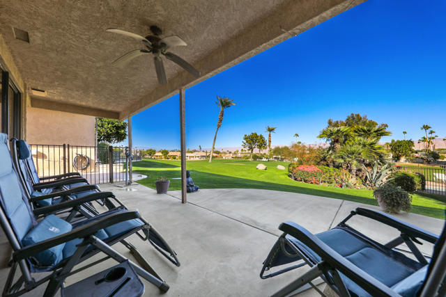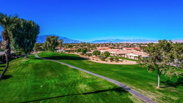 Beautiful Mountain and Pool views from this spacious condo located on the 2nd fairway of the famous Bermuda Dunes Country Club. Home features THREE bathrooms and THREE large bedrooms. New cabinets & countertops in all of the bathrooms recently installed. Gourmet kitchen boasts granite countertops, custom tile backsplash and warm wood cabinets - plus a convenient wet bar. Kitchen is adjacent to the dining area, which flows into the Texas-sized Great Room with built-in entertainment center plus walls of glass which bring in lots of light. The glass sliders open to the expansive patio area which is great for entertaining or just enjoying the terrific VIEWS. The primary bedroom has plenty of room to roam and also a slider to the rear patio, plus its own full bathroom and walk-in closet. The other two bedrooms, each with a 3/4 bath, are separated by a convenient center patio with flowers and views of the SOUTH mountains. Home has a laundry room, which also houses the water heater. There is a detached, oversized two-car garage which is steps from the home. IID for lower electric. BD Security of $214 a month includes cable TV with Showtime/HBO/Cinemax plus internet with Spectrum and 24-hour guard gated security. Prado Verde HOA of only $560 a month includes exterior maintenance (incl. roof), gardening, pool/spa maintenance, trash and water. Bermuda Dunes Country Club offers many options for membership, but you do NOT have to join - See attached membership information