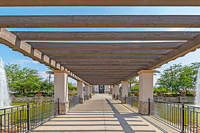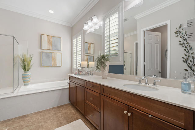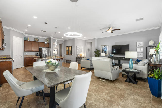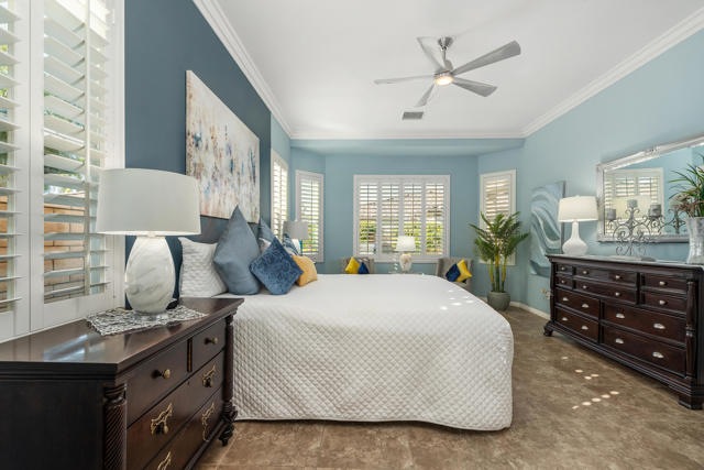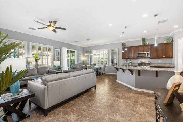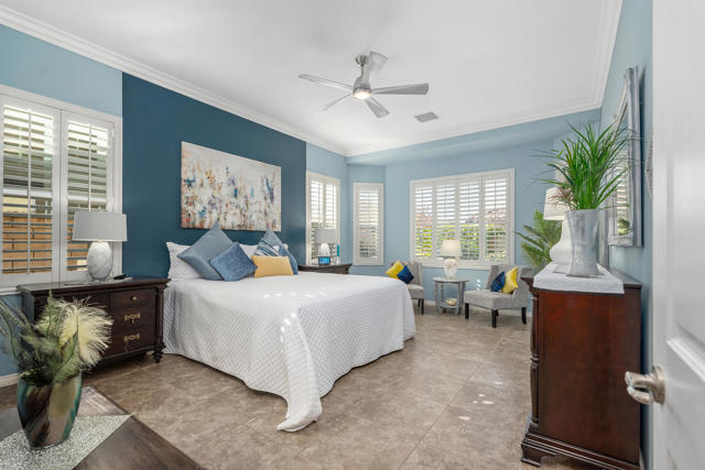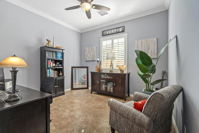 Welcome to a home where effortless living and meticulous attention to detail create a true desert sanctuary. From the moment you arrive, the curb appeal sets the tone: a beautiful treed canopy frames the property, shading a hybrid desert-scape accented with lush artificial turf and thoughtfully curated plantings.Step through the custom front door and feel the warmth and refinement unfold seamlessly. This 2 bedroom + den (easily converted to a third bedroom), 2 bath home spans 1,910 sq. ft. and has been crafted with care in every corner. Tile flooring guides you throughout the home, while high ceilings, crown molding, and plantation shutters throughout enhance the space and sophistication. Soft, calming colors wrap each room in a welcoming embrace.The great room is the heart of the home -- intimate enough for quiet evenings, yet generous enough for entertaining. The kitchen is perfectly designed for everyday living and gatherings alike, featuring abundant cabinetry, spacious countertops, a large walk-in pantry, and an oversized island where friends and family naturally gather.Step outside and the feeling of serenity continues. An oversized covered patio overlooks the lush, private backyard, where the gentle pitter-patter of a tranquil fountain reminds you that life is good and peace is here.Off a short hallway, the primary bedroom is a perfect place to unwind and recharge, with a bath boasting dual vanities, a separate shower and soaking tub, and a large walk-in closet.With plenty of storage, including an additional room for your private treasures or perhaps a crafting place and the 2 car attached garage, you can elevate your comfort, ease and livability, life here is simple, enjoyable and feels complete the moment you arrive.Located in the vibrant 55+ community of Four Seasons at Terra Lago, residents enjoy a large clubhouse, fitness center, indoor and outdoor pools, library, bocce ball, tennis, and a variety of clubs and activities. Just minutes from dining, shopping, and Fantasy Springs & Spotlight 29 Casinos, this home blends comfort, convenience, and the best of desert living.