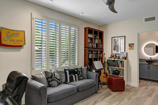 Stunning Acacia 4 - Completely Remodeled on a Rare Oversized Lot in Indian Ridge Country Club in Palm Desert! Step into luxury with this beautifully reimagined Acacia 4, where no detail has been overlooked. Situated on an expansive lot, this home offers an inviting front courtyard featuring a cozy fireplace, built-in BBQ, lush landscaping, and abundant southern sunshine--perfect for year-round outdoor living. Inside, every room has been meticulously updated with Italian wood-look porcelain tile, 6'' baseboards, LED and art lighting, fresh paint, and modernized hardware throughout. The spa-like bathrooms are a true standout, showcasing granite countertops, glass tile backsplashes, refinished cabinetry, frameless glass-enclosed showers with rainfall showerheads, and LED-lit mirrors. Beyond aesthetics, this home is packed with upgrades, including two newer A/C units with heat pump, a newer water heater, an electronic leak detection system, and 30 fully paid solar panels for energy efficiency. When you are tired of the sun, you can enjoy breathtaking views of the 4th hole of the Grove course from your covered back patio, with ample space to build a spa. This is desert living at its finest!Offered furnished per inventory list. Club and Golf Membership options available. Don't miss this exceptional opportunity--schedule your private showing today!