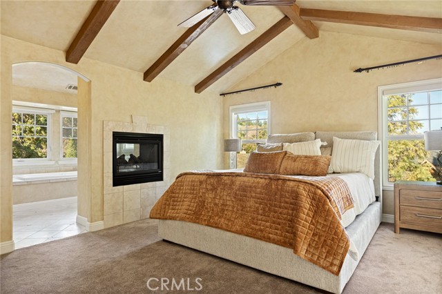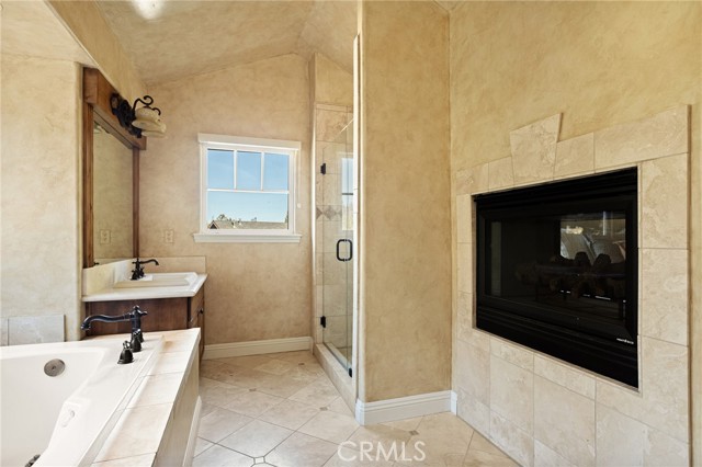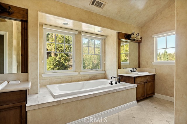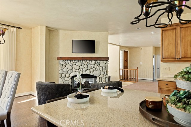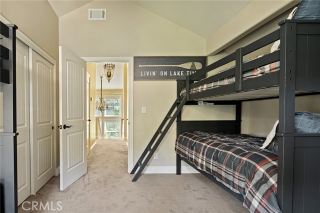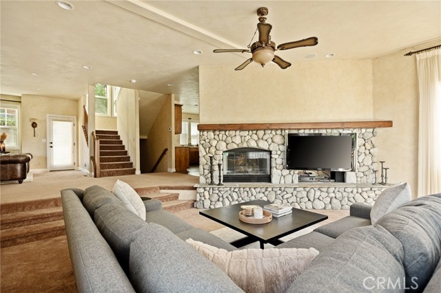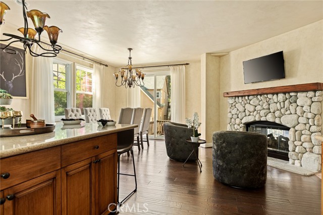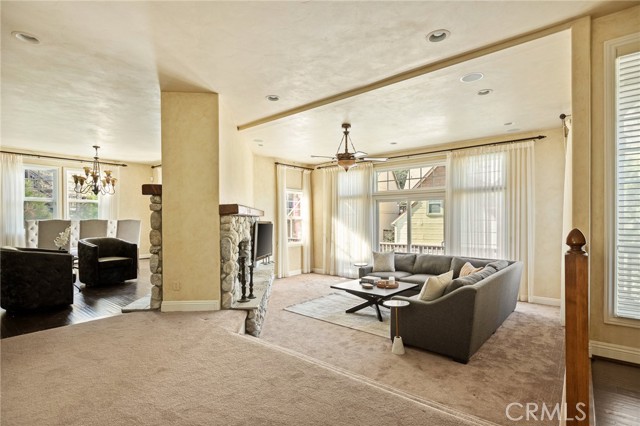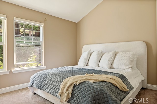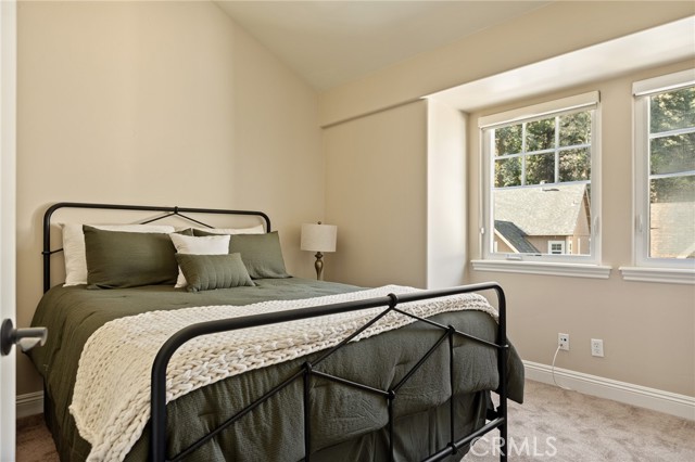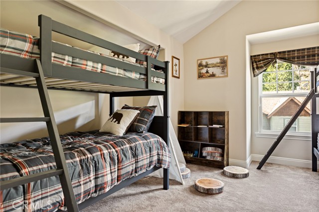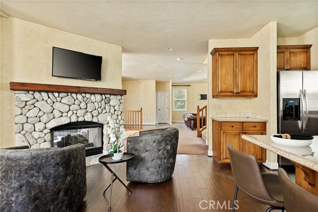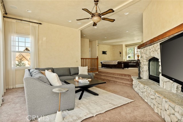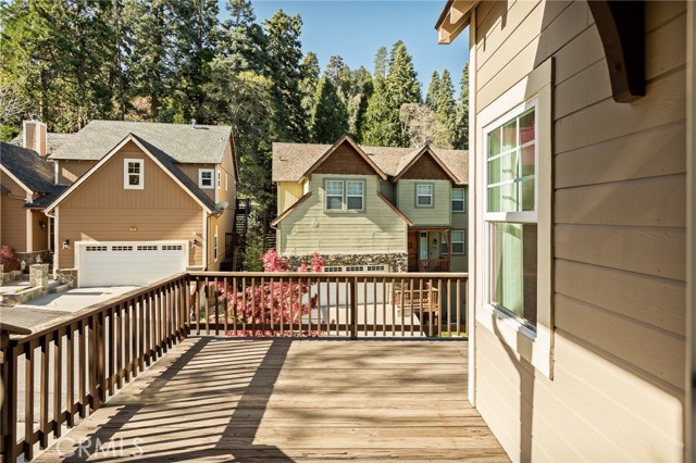 Nestled in the highly sought-after gated community of Arrowhead Canyon—a neighborhood celebrated for its ease of low-maintenance mountain living. This home also includes lake rights to beautiful Lake Arrowhead, adding even greater appeal to its idyllic location. Privately situated on one of the community's quieter streets, this home offers abundant parking, including a spacious two-car garage, driveway parking for two vehicles, and convenient additional community parking nearby. Proudly presented by the original owners, this residence exudes pride of ownership and tasteful upgrades throughout. Step inside to discover builder-upgraded wood flooring in the kitchen and entry, setting a warm and modern mountain aesthetic. Custom faux wall texture adds elegance to every room, enhancing the home's distinctive character. The inviting sunken living room features a stunning river rock fireplace, thoughtfully positioned between the main living room and the dining/kitchen area, creating a seamless flow ideal for entertaining. A large secondary living space provides versatile options for a formal sitting area, additional family room, or an entertainment bar area. The open-concept kitchen is a chef’s delight, featuring granite countertops, stainless steel appliances, rich wood cabinetry, and custom lighting fixtures that highlight both the kitchen and dining spaces beautifully. Enjoy the tranquility of mountain living with two distinct outdoor spaces—a charming front deck that overlooks the lush, forested surroundings, perfect for morning coffee or relaxing evenings, and a secluded back patio providing a private retreat for intimate gatherings. Upstairs, you'll find three spacious guest bedrooms sharing a timelessly styled full bathroom & additional powder room, perfect for family or guests. The luxurious primary suite offers ample space and sophistication with vaulted ceilings, exposed wood beams, and a cozy, intimate fireplace situated between the bedroom and en suite bath. The primary bath pampers with dual sinks, a relaxing soaking tub, a walk-in shower, abundant natural lighting, and an expansive walk-in closet. On the lower level, a spacious game room awaits, ideal for entertaining with a dedicated pool table area and a comfortable TV lounge for enjoying sports or movie nights. Additional comforts include dual-zone air conditioning and heating & custom window treatments. Experience comfort, elegance, and convenience in the heart of Arrowhead Canyon.