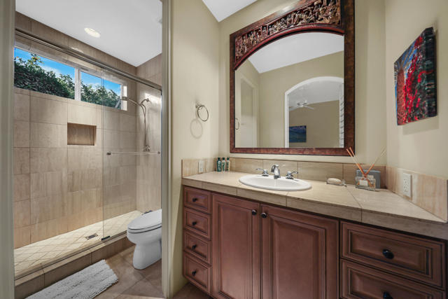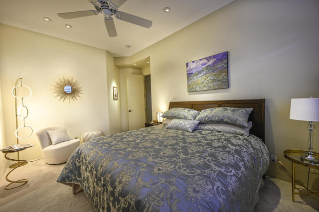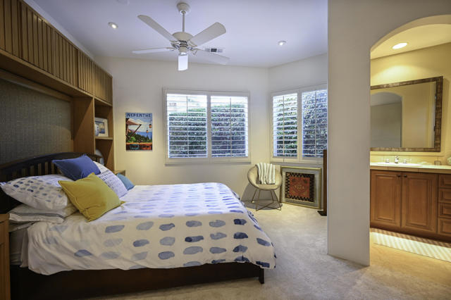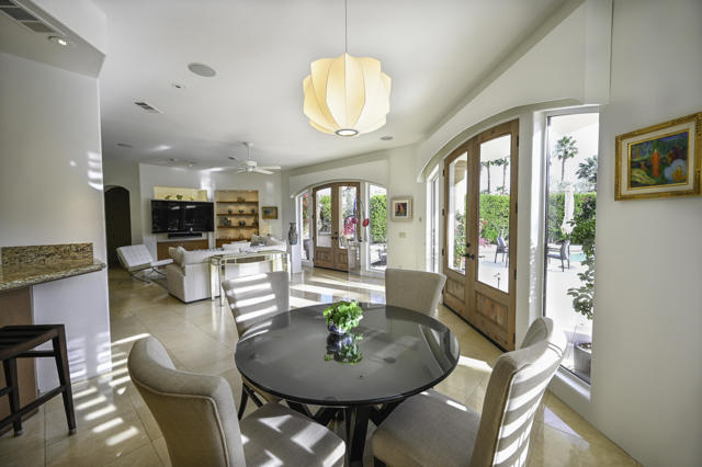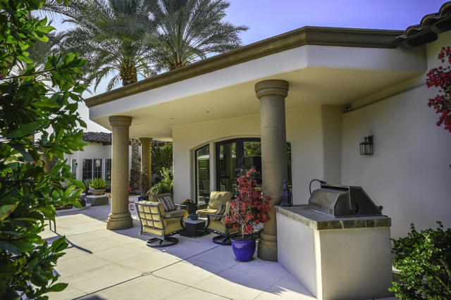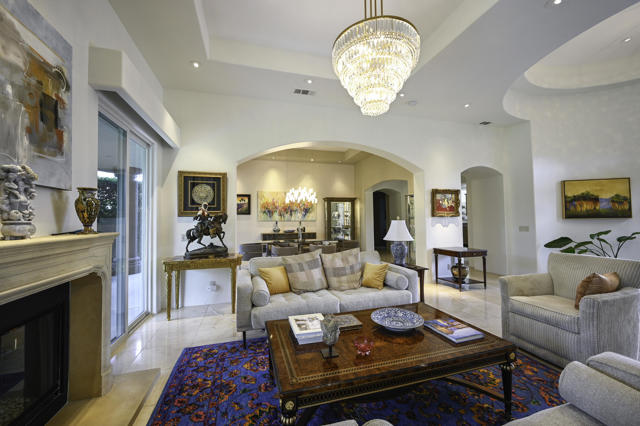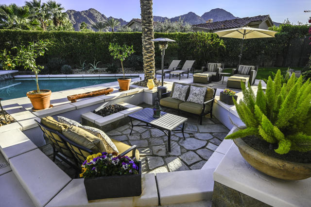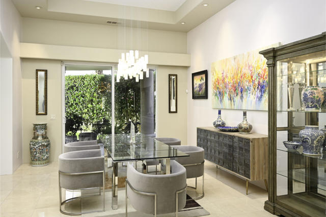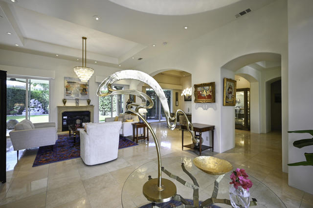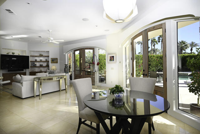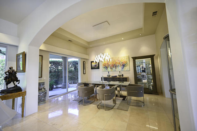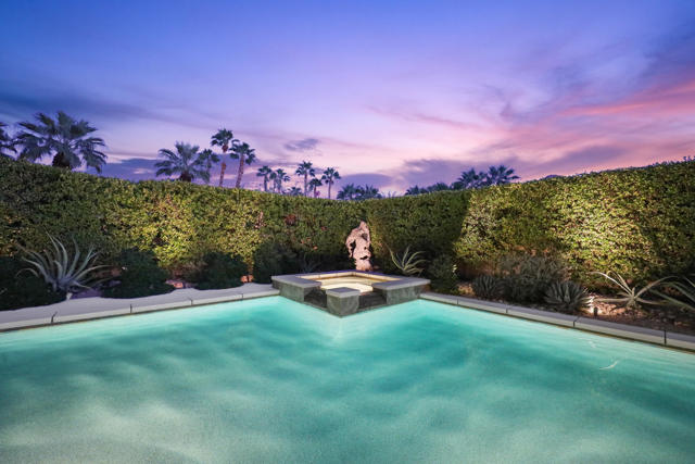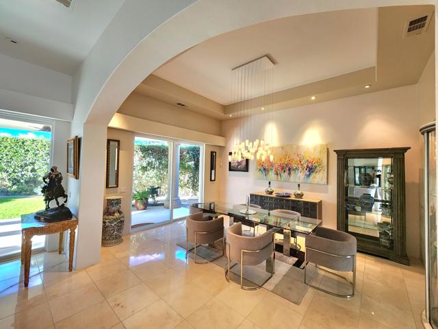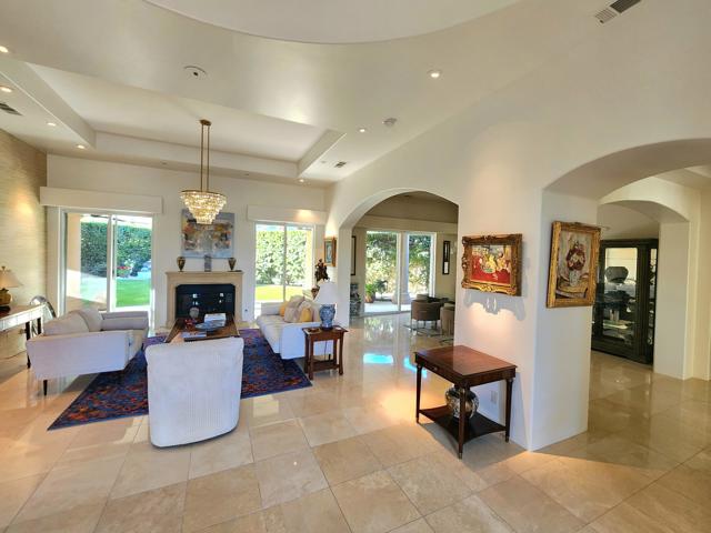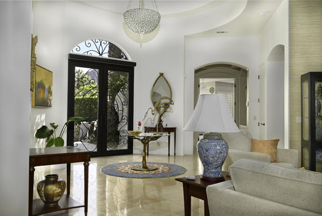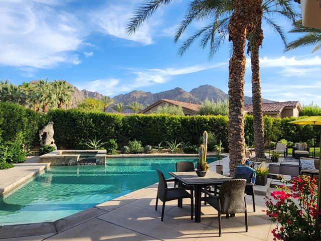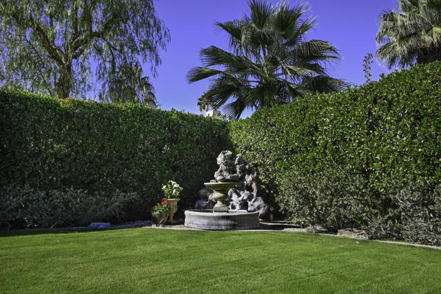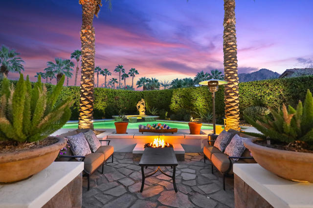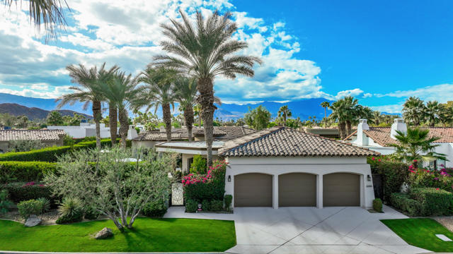 Elegant large Mediterranean home in Indian Wells Country Club just a short cart ride from the golf course and Clubhouse. Quiet cul-de-sac location, bright south-facing Santa Rosa mountain views, serene garden setting and extremely private, this showcase residence sits on almost half an acre of mature landscaping with date palms, ficus, pomegranate, natal plums and agave. The residence comprises 3,832 square feet, 4 ensuite bedrooms and 5 baths, with the grounds including a large triangular pool with double waterfall, and huge patio plus sunken fire pit for those starry desert evenings. Built in 2002 the property had numerous updates by meticulous owner in 2023, including new 3-zone HVACs, pool equipment, windows, flooring, security, and exterior fixtures. This stunning home offers an easy flow from formal entertaining areas beginning with a soaring grand entry foyer and chandelier to more casual family living spaces with multiple French doors, archways, and spectacular lighting. Custom features include built-ins and art display areas, a bar, spa-like primary bath and large walk-in closet, GE Monogram appliances, recessed accent lighting, Sonos surround sound with ceiling speakers, a shaded rear patio with fans, triple garage with AC, and even a pool chiller! Rare opportunity to walk in with no projects and just enjoy all the benefits of living in Indian Wells. Offered furnished. Owner is agent.