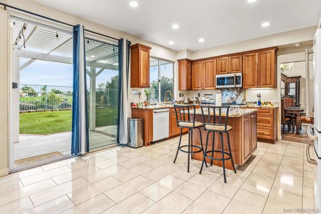 Beautiful 4-bed, 3 bath two-story with bright open layout and soaring ceilings. Wood flooring, granite kitchen with backsplash, modern appliances, walk-in pantry, and seamless flow into the family room with fireplace. Main-level bedroom and full bath—ideal for guests or office. All bathrooms have been remodeled with stylish finishes. The upstairs primary suite features panoramic views and a spa bath with a walk-in shower, soaking tub, dual sinks, and a remodeled walk-in closet. Private backyard with no rear neighbors, covered patio, concrete slab, turf, fruit trees, and a 30-ft enclosed dog run. Near Libby Lake Park and approx 8 miles to Oceanside Pier & Beach.