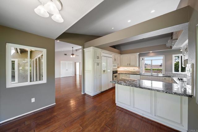 This move-in ready home is located in the gated Terrace Downs community in Bonsall, CA. Enjoy privacy, beautifully maintained grounds, a community pool, and proximity to River Village shopping and top-rated Bonsall schools. The open floor plan features vaulted ceilings, a spacious living room with fireplace, and a south-facing composite deck perfect for relaxing or entertaining. The stylish and functional kitchen includes granite countertops, wood flooring, recessed lighting, pull-out shelving, and a bright breakfast nook with scenic views. The dining area opens to a private stone patio with a retractable awning. The primary suite offers a walk-in closet, en-suite bath with skylight, soaking tub, and large shower. Two additional bedrooms are located on the opposite side of the home. All bedrooms have new carpet, and both bathrooms feature updated toilets. HOA covers yard and exterior maintenance, irrigation water, roof, gated security, and pool access. Though the home lives like a single story, there are stairs from the garage or driveway to the main level. No age restrictions. This well-maintained home blends comfort, convenience, and the beauty of Bonsall living. Note: Some photos have been virtually staged for marketing purposes.