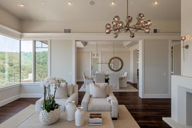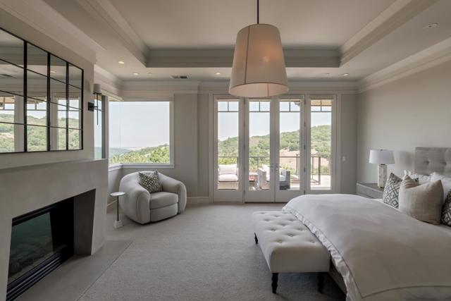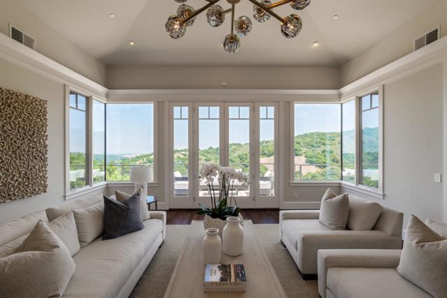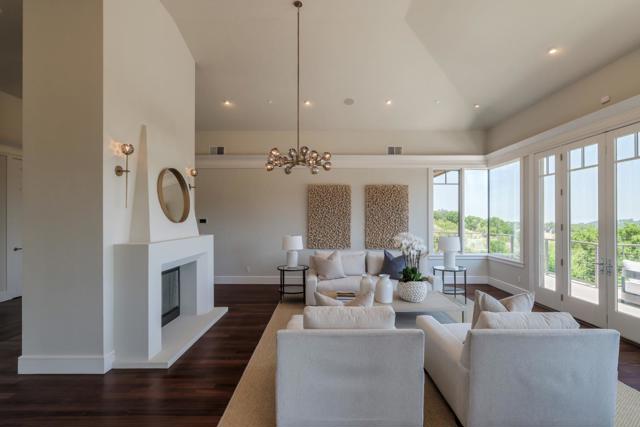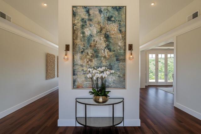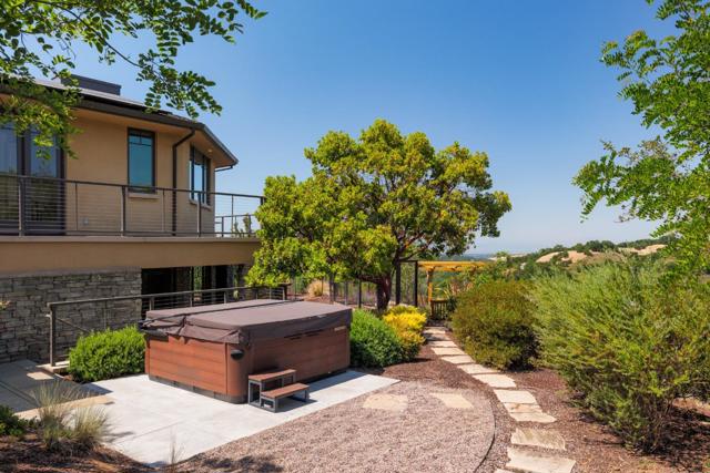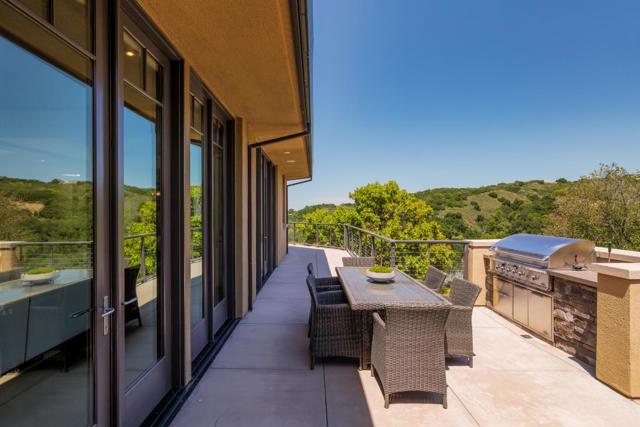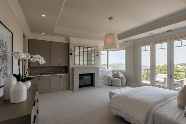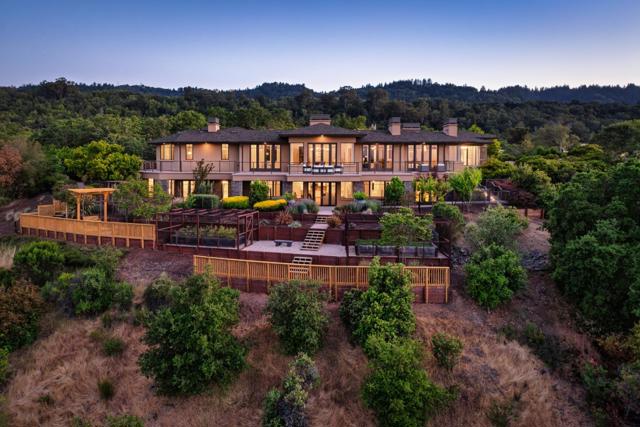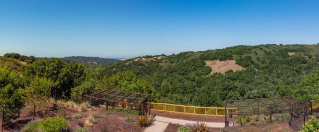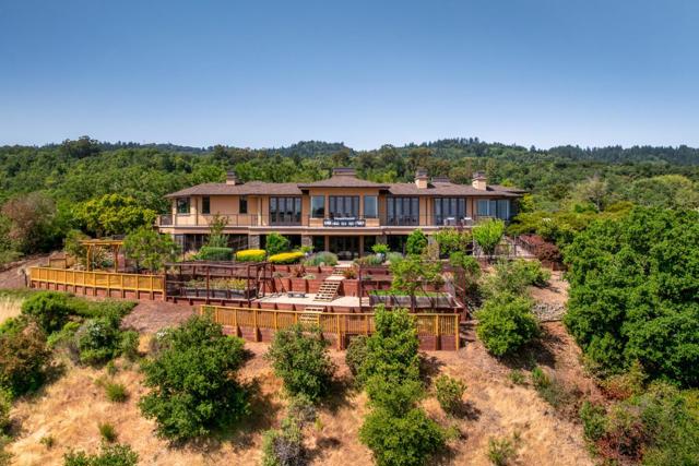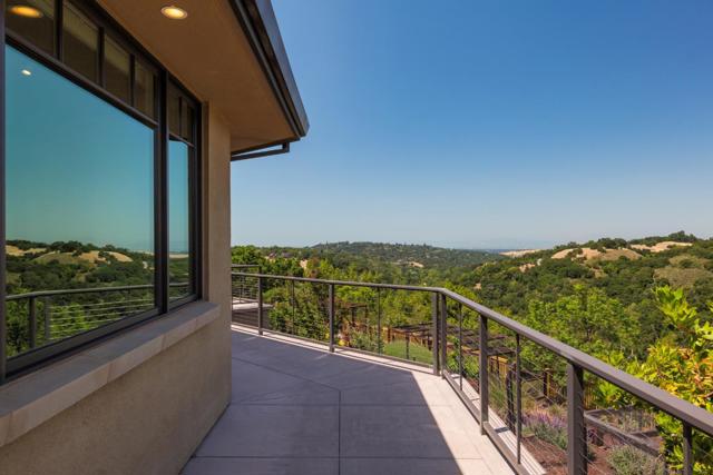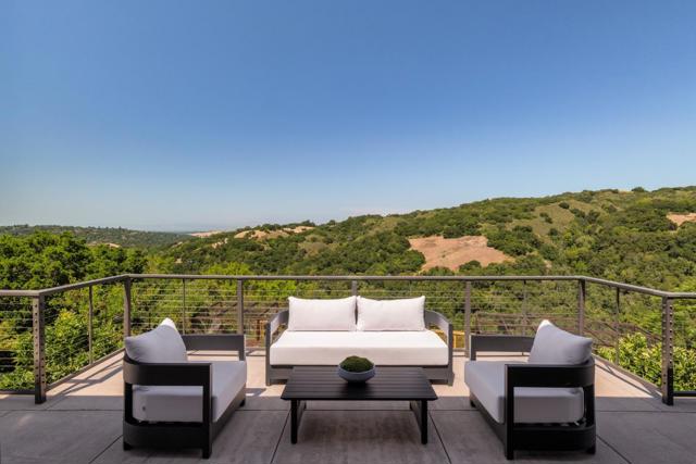 Prominently perched on the Portola Valley hillside, this contemporary home has been upgraded with the finest materials and craftsmanship providing glorious panoramic views of rolling hills with Silicon Valley and the Bay in the distance. This home is elegant, sophisticated and secluded and just a short drive to Silicon Valley with easy freeway access. The flexible floor plan includes six bedroom suites, dedicated office/den with fireplace, living room with soaring ceilings, fireplace, adjacent balcony and forever views, great room with access to the outdoor kitchen and spa plus a gathering spot and an in-home theater on the lower level. The kitchen is appointed with high-end appliances, butlers pantry, island and breakfast bar, all open to the casual dining/family room--perfect for intimate gatherings and sufficient for hosting formal dinner parties or large events. The garden boasts wrap around balconies and patios, views, beautiful plantings in front and sunny, enclosed fruit/vegetable beds below. Solar power system with robust Tesla battery support, 5 zone heat & A/C, full property security system, two laundry facilities, two two-car garages and community pool/spa complete this move-in ready home. Top rated Portola Valley schools. Close by hiking/biking/equestrian trails.