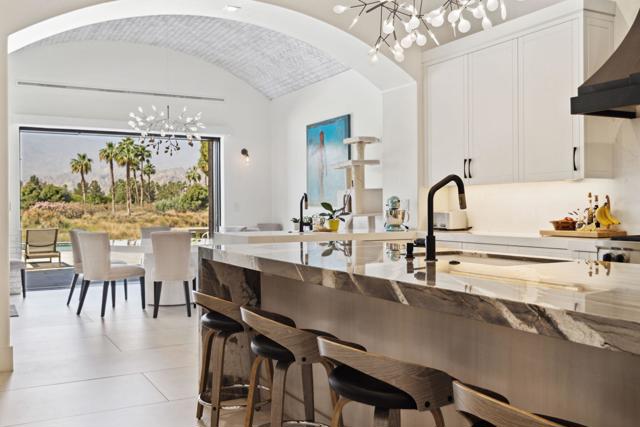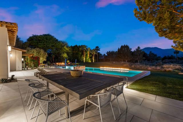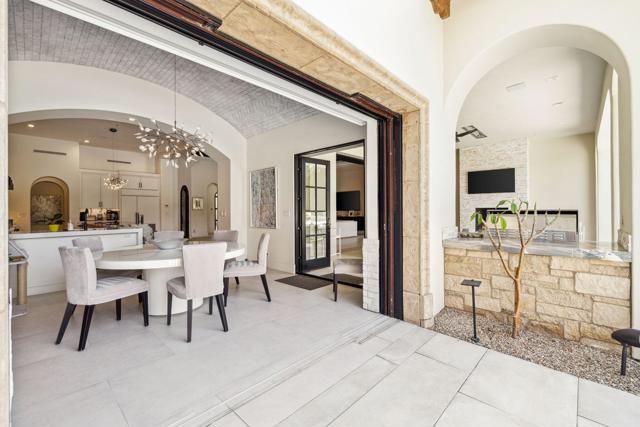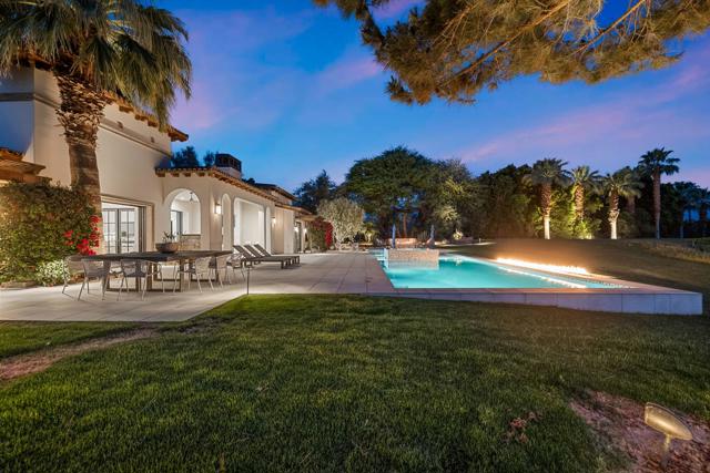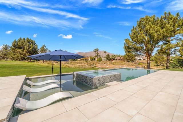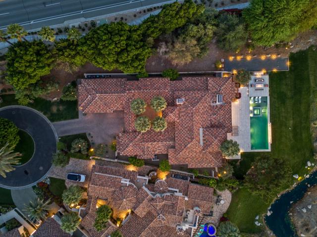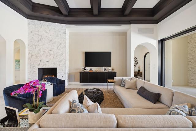 Welcome to one of the most remarkable properties in the prestigious Hideaway community of South La Quinta. Perhaps one of the largest and most private residences in the entire community, this 20K sq ft lot expands into acres of unobstructed southwest facing mountain views. With no other homes in sight from the interior view, this residence provides what is unparalleled privacy that is unique and will remain forever. The property has been transformed by the current owners over the last 12 years, expanding the initial lot through a land purchase from the club in 2014 and then subsequent work over the years has resulted in what can only be described as exposing a previous diamond in the rough. Positioned on the 16th hole of the Clive Clark course, this home is perfectly positioned at the end of a rare single lined cul-de-sac. This 5-bedroom, 5 1/2-bathroom residence all on one floor, features dual master suites, a fully enclosed courtyard entry that sets the tone for the refined living within. The interior showcases timeless architectural details including arched doorways and a modern wood coffered ceiling in the great room. A recent complete re-model blends classic Hideaway style with a modern flare, the result is a true turnkey opportunity for those looking for something special. Wall-to-wall pocket doors seamlessly connect indoor and outdoor living, leading to a sprawling covered patio with a built-in outdoor grill, firepit, and fireplace. The resort-style backyard is a true desert paradise, featuring a 40 ft pool with an elevated spa and baja shelf that leads to a perfect setting with a special view. The updated rear of the property is accentuated with fire features both at the pool's edge and an elevated outdoor entertaining area with firepit. Adjacent to the firepit is your own lighted bocce ball court. The property has a professionally designed outdoor sound system encompassing buried subwoofers and 16 speakers for an unparalleled and private listening experience. 53731 Via Mallorca, a rare and refined offering in one of the desert's most exclusive enclaves--this is Hideaway living at its finest.