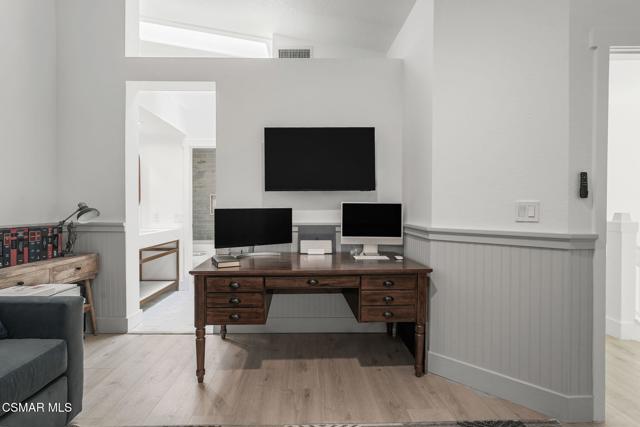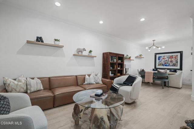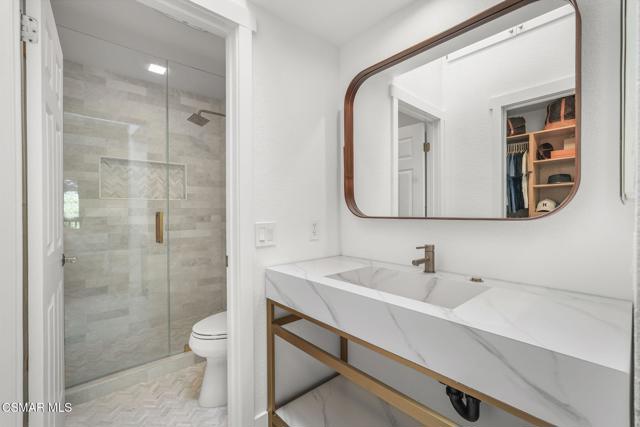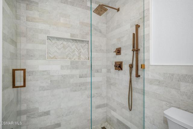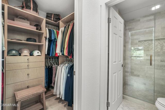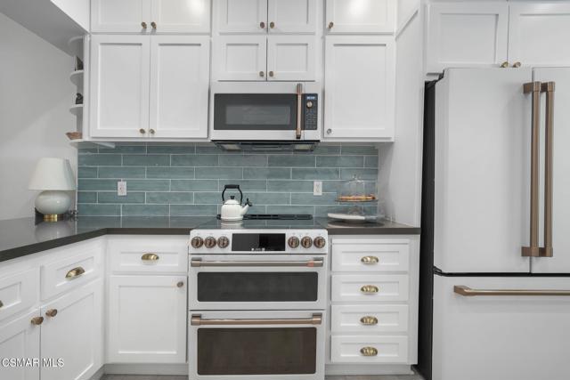 Elegantly updated in 2023, this timeless home features the following: Wide plank performance grade flooring throughout (AC6 durability rated for high traffic areas, kids, and pets!), updated dream kitchen which includes soft close cabinets/drawers, quartz countertops, chef worthy cafe line appliances with accent champagne bronze hardware finishes, oak floating shelves, polished ceramic backsplash tile, Moen sensor touch less faucet and deep under mounted kitchen sink. Directly off this designer kitchen boasts a lovely open concept dining area, living room, charming fireplace, elaborate high ceilings, recess lighting throughout, and a gorgeous, updated half bath off the main living room for your guests. Arrive at the second floor where you can find two bedrooms each with their own en suite bathrooms and custom walk-in closets. To your right walk into a vibrant primary suite equipped with large sliding glass doors that open to a private patio and nature. Enjoy a cup of coffee or a nighttime beverage while immersing yourself In all nature has to offer. Step back inside and enjoy on suite bathroom amenities featuring modern sleek vanity, champagne bronze fixtures, honed herringbone marble floors, custom shower glass doors, and a custom walk-in floor to ceiling honed marble shower that makes your private oasis feel like an exclusive luxury spa. Encompass yourself in floor to ceiling marble and enjoy the delta vero rainfall shower experience. Step outside your personal spa and enter into your custom walk-in closet featuring soft close drawers, shoe storage, bag storage, and ample clothing space. To the left of the second story landing boasts a stunning second bedroom which can be transformed for guests, office space, or a nursery. En suite second bedroom bath includes modern vanity, marble flooring, deep soaker tub, ceramic tile, delta Vero shower fixtures, and custom shower glass doors. Step outside this spa like experience and enter the second walk in closet of the house featuring soft close drawers, shoe shelving, and ample clothing space. Additional highlights include a one-car garage, smart home features and access to a community gym/exercise room for your daily workouts. For outdoor enthusiasts, enjoy the nearby hiking and biking trails, perfect for taking in the surrounding natural beauty.Centrally located between Westlake Village, Agoura, Calabasas and highly sought after school districts!This home is in the Shadow Oaks community - NOT Shadow Ridge. Conventional financing is approved.