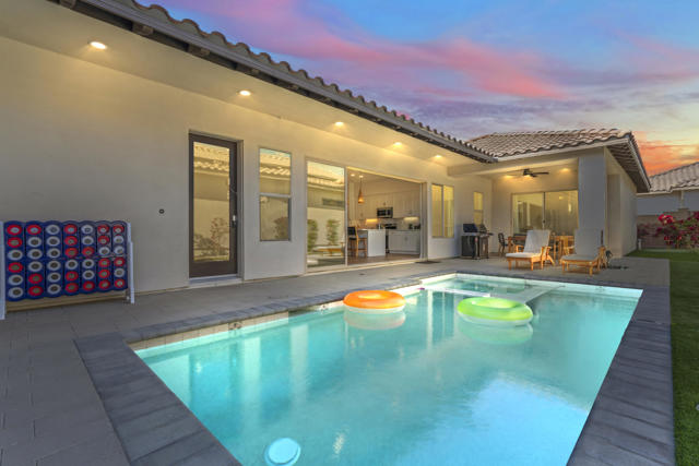 Welcome to Iconic Signature at PGA West, where resort-style living and investment potential meet under the desert sun! This stunning interior lot home blends privacy, elegance and opportunity, making it perfect as a private desert retreat or an exceptional income-producing property.Step inside to a bright and open floor plan where a dramatic wall of sliding glass doors floods the home with natural light and creates the ultimate indoor and outdoor living experience. The beautifully upgraded kitchen is a showpiece with quartz countertops, stainless steel appliances, custom tile backsplash and warm laminate wood flooring. Designer lighting, spa inspired bathrooms and soft neutral furnishings set the tone for relaxed sophistication throughout.Step outside and let the magic of the desert surround you. Sunny days and peaceful desert evenings are best enjoyed in your private outdoor oasis, complete with a sparkling pool and spa, covered patio for dining and lounging, and a playful putting green that brings the resort lifestyle home! Paid solar keeps costs low, and the spacious three car garage offers plenty of storage for golf carts, bikes and more.Signature at PGA West is the only community within PGA West that allows true short-term rentals under 30 days. This rare flexibility creates incredible income potential and strong year-round demand. All of this is located just minutes from world-class golf tournaments, Polo Grounds, iconic festivals, shopping, dining and more!Fully furnished and turnkey, this property is ready for you to start enjoying as your vacation home, primary or renting from day one!