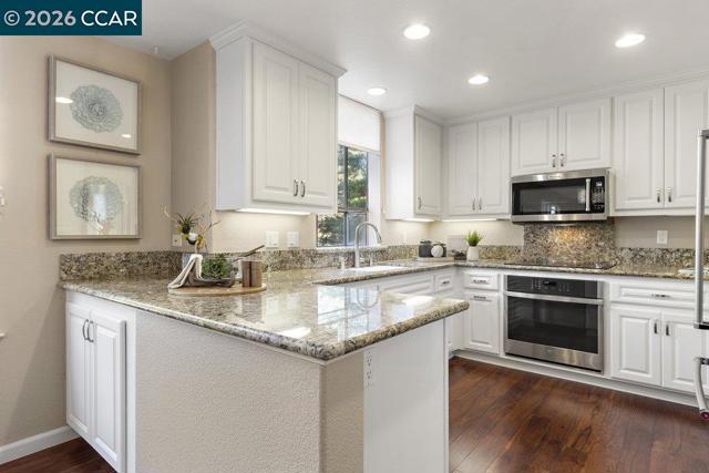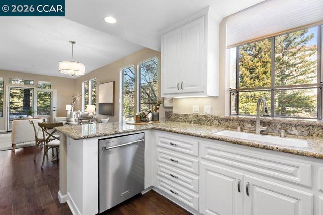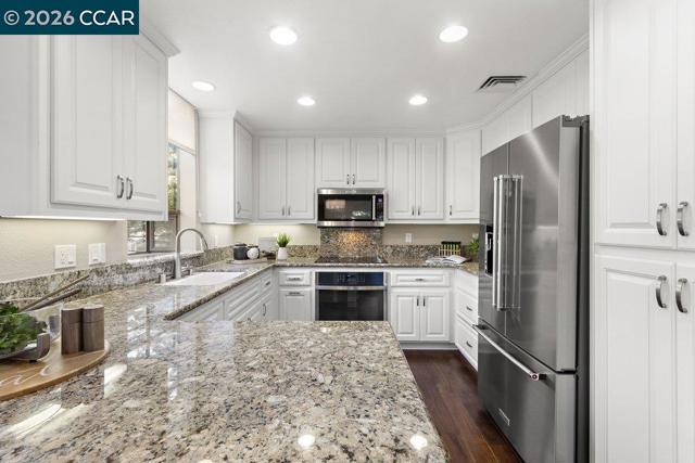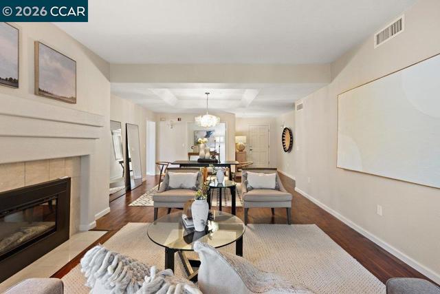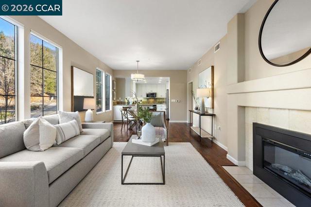 Welcome to the Summit at Pinnacle Ridge! This first floor condo with an expansive patio is one of the newest and largest models in all of Rossmoor with almost 1,900 square feet of contemporary living space featuring both a Living Room and a Family Room, separated by a dual-sided fireplace fitted with convenient electric inserts for instant ambiance. An elegant Dining Area is perfect for entertaining while the Breakfast Area off the Kitchen is great for everyday meals. The Kitchen has been beautifully remodeled with timeless all-white cabinetry and stone counters, top-of-the-line stainless steel appliances, under cabinet lighting, and more. Built-in bookcases have been added in the Den, making it the perfect home office or TV room. Guests will appreciate the proximity of the Guest Bathroom to the Secondary Bedroom and you'll love the privacy of the corner Primary Bedroom Suite alit with natural light from a wall of windows. The Primary Bathroom features a dual sink vanity, large stall shower, built-in cabinetry, and walk-in closet. Elevator access and the end-unit location means it is accessible for all and underground parking protects you from the elements. Be sure not to miss one of the few private neighborhood pools just up the street.