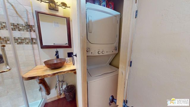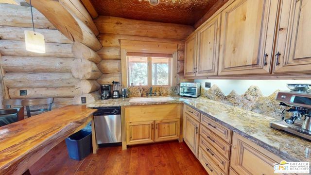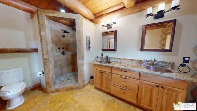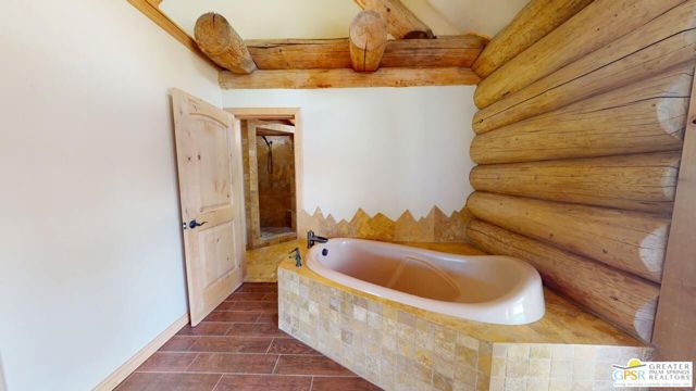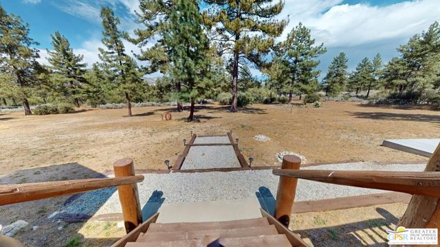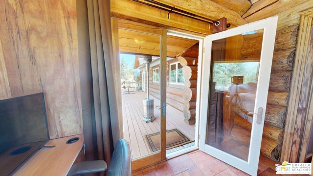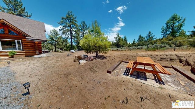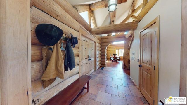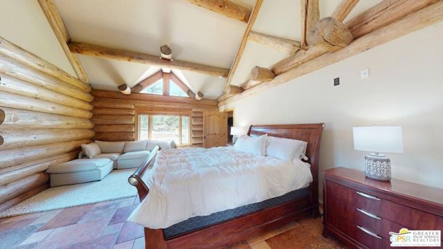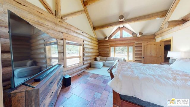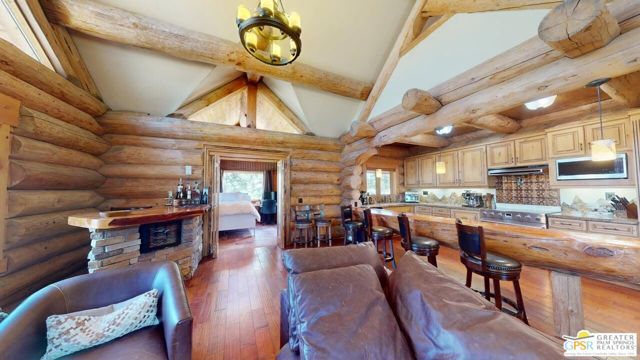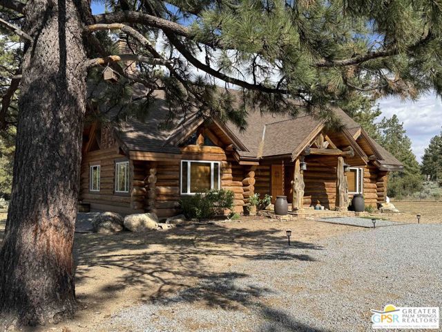 NEW PRICE for this one-of-a-kind Log Home. It will be a special place for you to call home. Whether used for full-time residency or as a second home, the serenity of this open concept 4.5 acres, is sure to please the most discerning buyer. The Log Home includes a large entry foyer which sets the stage for all the interior spaces of this home. To the left of the entry is the large Great Room with wood burning fireplace, Dining area and Kitchen featuring a whimsical breakfast bar made entirely of a free form log - stunning! The two-story plus high ceilings and the use of the natural log walls lend themselves to the unique character of this special residence. The Great Room is light and bright just perfect for both intimate gatherings or large-scale parties. The views of the mountains in the distance are incredible. The kitchen features granite counters with custom designed backsplashes that depict the mountains - very clever - plus the new electric range/oven, pot-filler and vent hood, double door refrigerator, microwave oven, dishwasher and a semi-hidden pantry closet under the stairs to the loft complete the open kitchen. There is a free form log bar in the corner of the Great Room as well. To the right of the front door is access to the large Primary First Floor Suite with extremely high ceilings and a ceiling fan and access to the combination dressing room/spa room and then on to the primary ensuite bath. The stall shower has beautiful stone work. The double vanity, with granite counters, is great as well. The views from the bathroom and primary suite are exquisite, as they are from the other rooms in this well designed home. The dressing/spa room offers direct access to the north facing deck with room for outdoor entertaining and the outdoor spa, just a few steps away. At the other end of the home, the French doors off the Great Room lead to the first floor bedroom, which could also be used as an office or study. This room also offers access to the north facing deck. Besides the first floor bathroom - with the stackable laundry closet - up the stairs is the additional lofted bedroom - extremely light and bright featuring lovely views to the north. The property is well maintained with pastures for a myriad of uses and the electronically operated iron gate sets the stage for what awaits owners and visitors to this massive property. Located within a 45 minute drive to Palm Desert - El Paseo - shopping and dining and the property is about a 25 minute drive to Idyllwild/Pine Cove. The Paradise Valley Cafe, at the corner of Hwy 371 and Hwy 74 is a great dining location just a few miles to the east of the property. The community has it's own clubhouse known as the Garner Valley Property Owners Association also located on Devils Ladder Road. Easy to show. Welcome to your new Mountain Home!