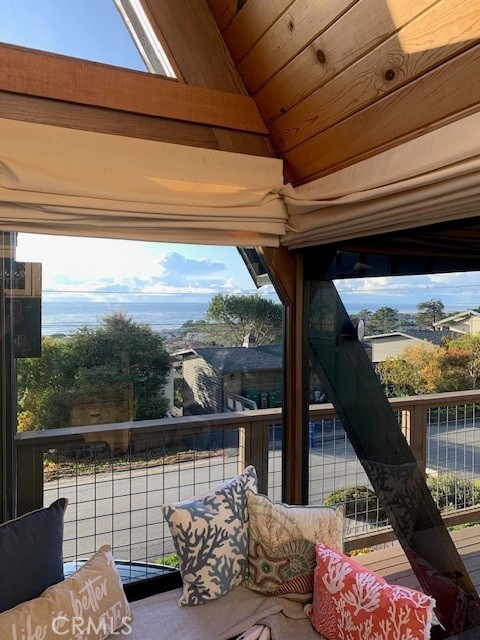 Rental fee includes all utilities and housekeeping twice monthly!! Welcome to one of the most distinctive homes on the Central Coast—a cozy A-frame cabin crafted with natural materials including hardwood, tile, and glass, accented by artistic details at every turn. The centerpiece is the breathtaking ocean view, complemented by additional view corridors from the bedrooms and loft. The layout makes thoughtful use of space, featuring a functional yet elegant kitchen and dining area, along with seating nooks perfectly positioned to frame the coastal scenery. Outdoors, enjoy both front and back patios surrounded by charming gardens and a flowering arbor. The home offers two primary bedrooms, one on the entry level for convenient single-level living. Each bedroom includes its own bathroom and closet. A spacious flex room on first level invites endless possibilities—whether for exercise, yoga, meditation, or a personalized workspace. The loft also provides a desk, built-in cabinetry, a sofa, and additional seating. While tastefully furnished, the home leaves certain areas open for you to customize as you wish. The kitchen is both stylish and practical, with a farmhouse apron sink, tile countertops, glass-front cabinets, stainless steel appliances, and a breakfast bar for casual dining. The living and dining rooms showcase the home’s dramatic A-frame glass front, offering unobstructed views of the Pacific. Whether you’re planning to stay a year or two, or use it as a serene retreat close to your primary residence, this soulful sanctuary captures the essence of Cambria living at its finest.