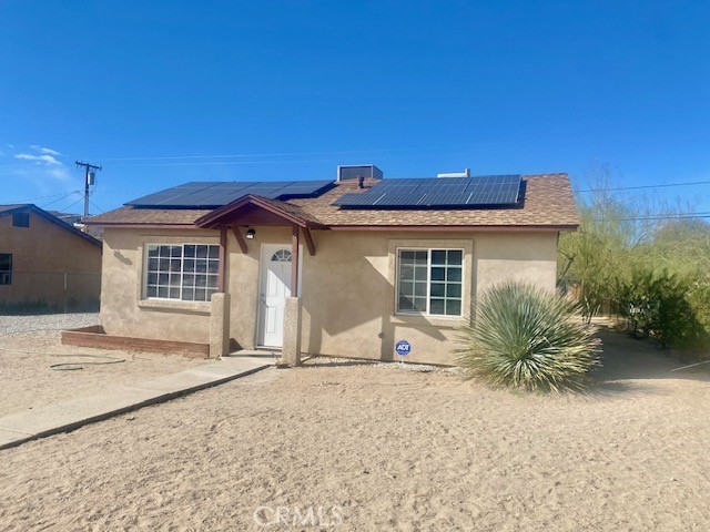 Well-located and functional, this 2-bedroom, 2-bath property has over 1000 sq ft of living space and sits on a fully chain-link fenced lot. large, flat yard—ideal for outdoor living, pets, or future projects. Tile floors throughout and recessed lighting. The large kitchen is equipped with granite countertops, dark cabinets, freestanding gas stove, and attached microwave. A convenient interior laundry closet right off of the kitchen. Huge master bedroom has recessed lighting and an attached master bath. A backyard shed provides additional storage or workspace. Conveniently located close to Highway 62, this property also features leased solar already installed for added energy efficiency. Current lease is $109/month buyer to take over contract. Current lease is paying for monthly electricity usage. A solid opportunity with a large, flat lot and great potential.