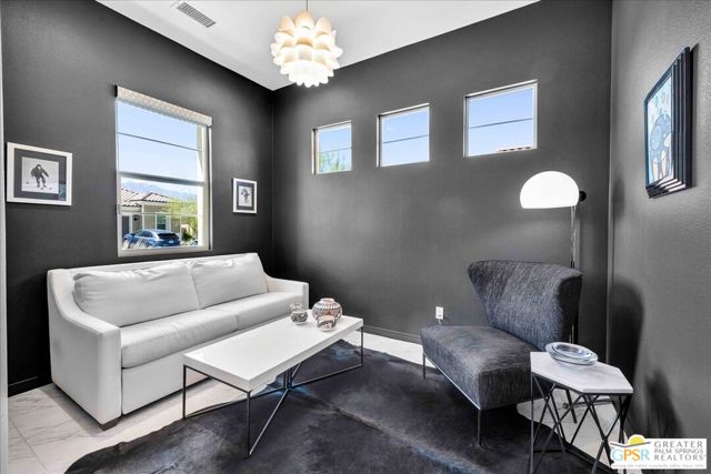 Resort-Style Elegance in Del Webb Rancho Mirage Experience the pinnacle of 55+ active-adult living in this exquisite Phase 4, Plan 2 Solitude residence with a spool, perfectly situated near the clubhouse in one of the community's most serene locations. This sophisticated retreat blends modern comfort with resort-inspired design, offering 2 bedrooms, 2 baths, and a versatile den - ideal for a home office, creative studio, or quiet reading lounge. The open-concept layout creates a seamless flow between the living, dining, and kitchen areas, framed by expansive windows that showcase breathtaking views of the Shadow Mountains. The chef's kitchen impresses with a sleek quartz island and countertops, upgraded 42" upper cabinetry, high-end gas cooktop, stainless steel appliances, and a spacious pantry - perfect for entertaining in effortless style. The primary suite is a private sanctuary featuring direct access to the spool area, a spa-like ensuite with dual vanities, a glass-enclosed shower, and an oversized walk-in closet. The secondary bedroom, thoughtfully positioned for privacy, offers a welcoming space for guests. Throughout the home, designer details shine - from polished porcelain tile flooring to bold black lacquer accents and multiple builder upgrades that elevate every room. Step outside to your own private desert oasis. The beautifully designed backyard features a lush faux lawn, striking hardscape with a built-in gas fire pit, and a glimmering spool with spa jets and tranquil water features - an ideal setting to unwind beneath the desert sky. A charming citrus garden adds a refreshing touch of color and fragrance to this exceptional outdoor retreat. Additional highlights include leased solar ($114.51/mo), a two-car attached garage, and a well-appointed laundry room with extra storage. Nestled within the prestigious guard-gated community of Del Webb Rancho Mirage, residents enjoy access to world-class amenities including a clubhouse, resort-style pool and spa, tennis and pickleball courts, state-of-the-art fitness center, putting green, billiards, and miles of scenic walking paths. Truly a must see.