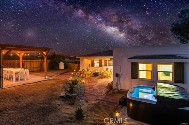 Spacious 4-bedroom, 2-bath desert home features a comfortable master suite and sits on over 0.55 acres of land, just minutes from Joshua Tree National Park and popular local attractions. Inside, enjoy polished concrete floors, a ductless mini split HVAC system, a beautifully updated kitchen with concrete countertops and full-height tile backsplash, and two spa-like baths. Step outside to a private, fenced yard with a covered patio, hot tub, fire pit, BBQ area, and a detached garage/studio — perfect for relaxing under starry skies. The garage is equipped with a septic tank, electricity already in place (no panel), and drain-side plumbing, making future improvements or a garage to ADU conversion simple and cost-effective. Whether you’re looking for a move-in-ready primary home, a turnkey Airbnb, or a property with income potential, this peaceful desert oasis is packed with character and limitless possibilities. Don’t miss this rare opportunity! Short-Term Rental Opportunity + Detached Garage with ADU Potential!