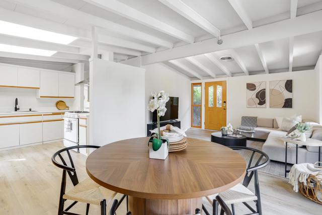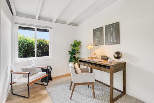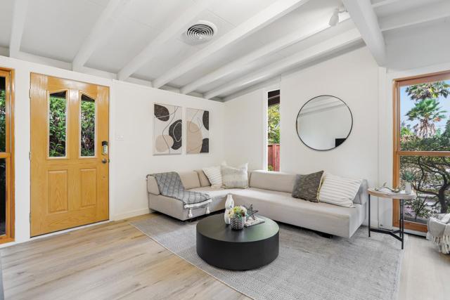 Step inside this impeccable mid century modern Santa Clara home (converted from 4 bedrom home can be easily converted back to 4 bedrooms). The bright & Spacious open living room with pitched ceiling that enhances the sense of spaciousness. The kitchen is a delight, offering a sunlit workspace with ample countertops for your culinary needs. Primary suite provides a quiet retreat with private bath. In-unit laundry adds everyday convenience. The home has an oversized bedroom with 2 closets & can be used as a flexible space, perfect for a home office, gym or converted back to 4 bedrooms. Outdoor living is a highlight of this property. The front courtyard is a serene retreat, fully fenced, complete with pavers & featuring graceful Japanese maple trees. The backyard is an entertainer's dream, boasting a spacious deck with built-in seating & patio area with pavers. Mature trees provide shade & a sense of privacy, creating the perfect backdrop for gatherings or quiet moments. The home also features one car garage with automatic opener, storage cabinets, central heating/AC, dual pane windows & LVP flooring throughout. Conveniently situated near shopping, commute routes & major tech companies like Apple and Nvidia. Easy walking distance to beautiful Homeridge Park & Sutter Elementary.