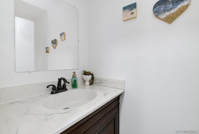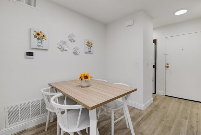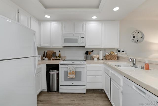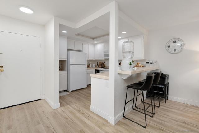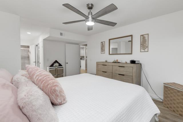 This move-in ready oversized 831 square foot condo offers a 1 bedroom, 1 bath, plus 1 half bath at the entry way. Truly a rare find nestled in the vibrant San Carlos neighborhood of San Diego. Conveniently located on the ground level, you will enjoy the sunny south facing exposures and western sunset views off the outdoor patio surrounded by lush greenery. Inside, find convenience and comfort with a cozy fireplace, central air conditioning and heating, an in-home washer and dryer, plus a fully equipped kitchen. As you walk into the bedroom.. space is not a problem, a queen, a king, a Cal-king mattress, you name it, it will fit. Dual closets collaborate with the primary bathroom and spacious countertops, plus a step-in shower. The condo comes with the privacy of a detached garage parking space and community guest parking for friends and family. This community boasts multiple pools, tennis courts, BBQ areas and a clubhouse ideal for those with active lifestyles. You'll love the beautiful landscaping and majestic fountains on evening walks at the Woodlands! The location is unbeatable, with the San Carlos library and the fabulous Mission Trails Park just moments away, offering excellent hiking and biking trails. Additionally, SDSU is conveniently nearby, making this an ideal spot for both relaxation and accessibility. Embrace the modern comforts and vibrant surroundings of this unique home.