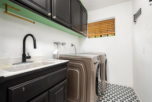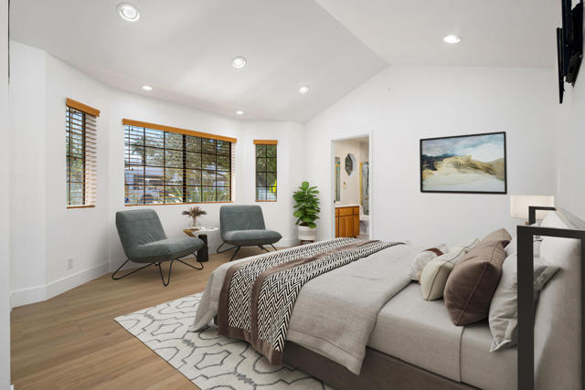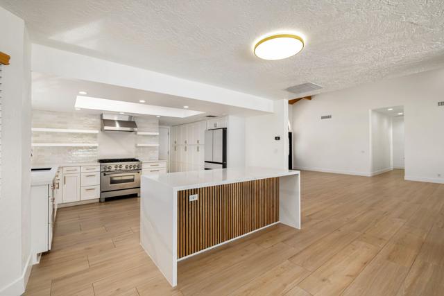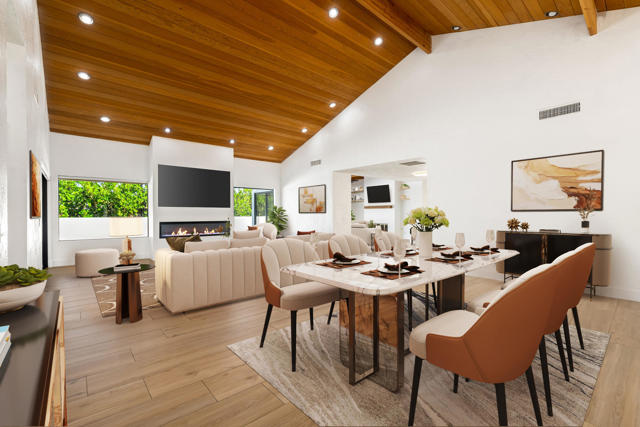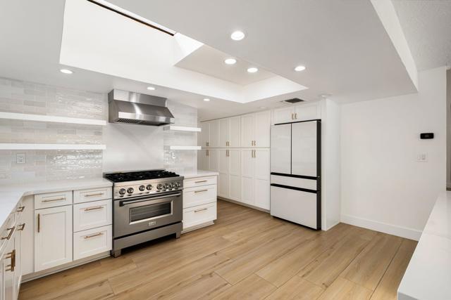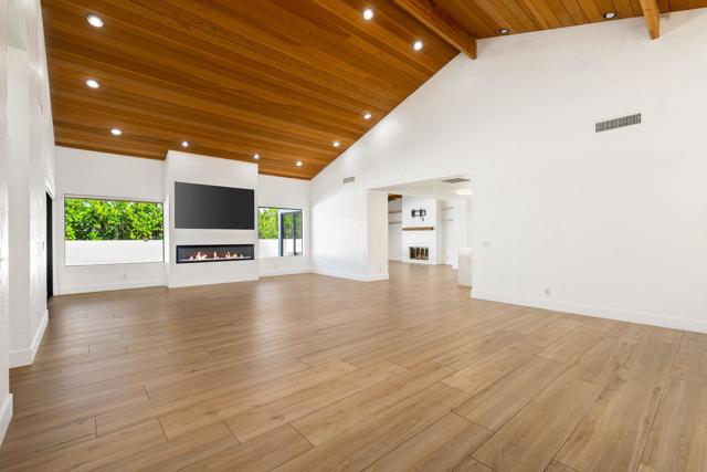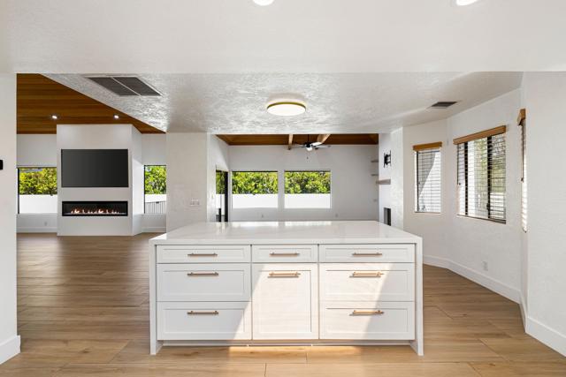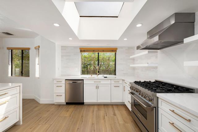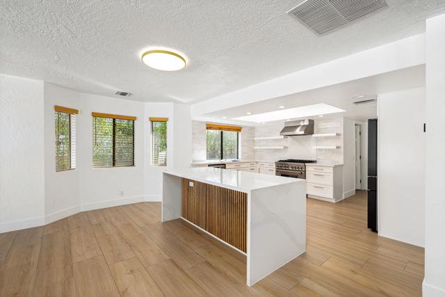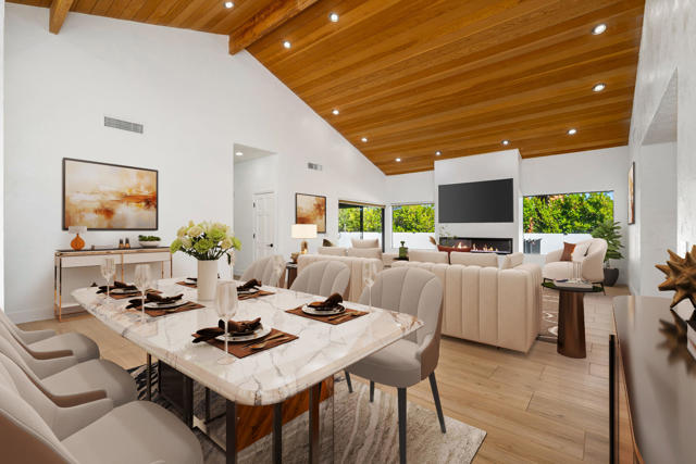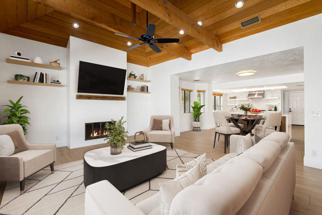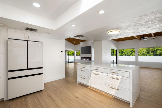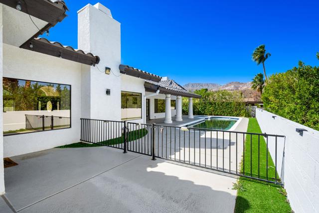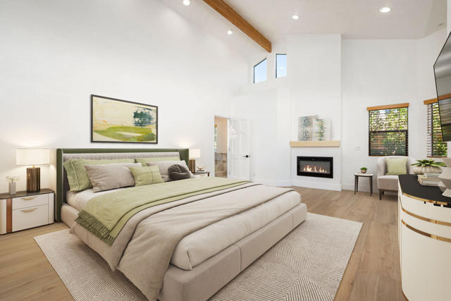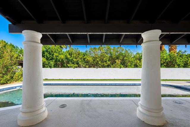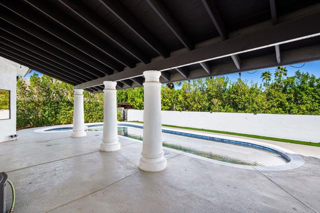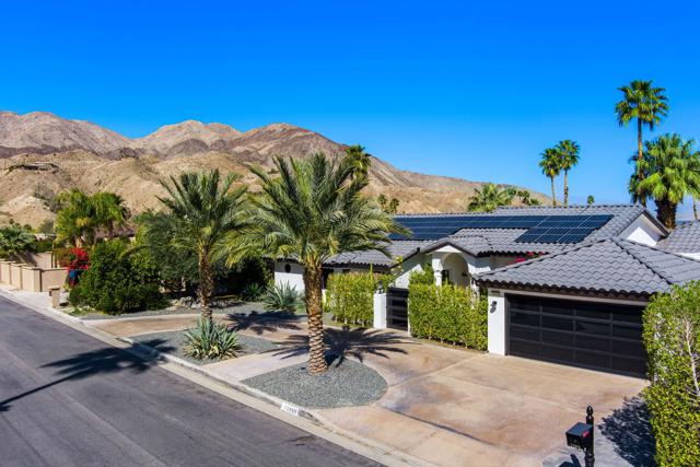 Dramatic South Palm Desert home close to El Paseo, 3 bedroom, 4 bathroom home with private pool & spa. Custom home with circular driveway, gated, soaring ceilings with open beams and wood, Open floor plan! 3 fireplaces (2 electric, 1 gas), Huge, beautiful remodeled kitchen with new cabinets, appliances and countertops opening to large beamed ceiling den with fireplace. room! Large laundry room with recently purchased washer and dryer and sink. Stunning, recently installed tile floors that look like oak and new updated floor molding. Large Primary Suite with spa tub & steam shower, vaulted ceiling, cedar walk-in closet and pool view. 3rd bedroom has custom built-in office features. Many newly done upgrades including Landscaping (large Palm Tress) and outdoor lighting black modern front security gate and matching glass garage door and leased solar. This house is beautifully appointed with many upgrades and privacy in a great location!