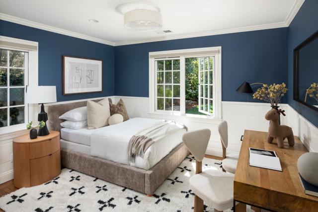 Wonderful west Menlo Park location, this tastefully remodeled south-facing home is filled with natural light and designed for comfort and style. A dramatic entry opens to an elegant living room with gas fireplace, backyard views, and French doors leading to a spacious great room. The family room features custom built-ins, and integrated desk and media space, flowing seamlessly to the rear yard and patio. Adjacent breakfast area is highlighted by a statement chandelier, while the chefs kitchen offers a skylight, large wood island with seating, Thermador gas range and double ovens, Sharp microwave, and white cabinetry with polished nickel hardware, glass display cabinets and large kitchen window.The thoughtfully designed floor plan includes primary suite with French doors to the yard and hot tub access, fireplace, custom shades, and a spa-like bath with marble finishes, dual vanity, soaking tub, and glass shower, plus a customized walk-in closet. A dedicated office completes the primary wing. An additional wing offers three additional bedrooms, including one en suite bedroom, and a remodeled dual-vanity hall bath. The serene backyard features a stone patio, lawn, lush gardens and privacy. All within close proximity to downtown Menlo Park, Stanford, parks, shopping, and top schools.