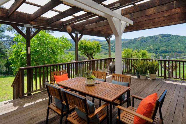 Experience the pinnacle of luxury living at this breathtaking estate nestled on 2.06 acres with panoramic hilltop views. This stunning five-bedroom, four-bathroom retreat boasts soaring ceilings, elegant fireplaces, The Kitchen has marble tile flooring, crown molding, recessed lighting, granite slab counter, tile backsplash and plenty of cabinetry. There is also floor to ceiling built-in cabinetry with pull-outs for extra storage, under stairs pantry with shelving plus a porcelain sink is set beneath a garden window. Stainless steel appliances include a LG French door refrigerator with water dispenser, Miele microwave, warming drawer, oven and dishwasher. The Island has a granite slab counter with overhang for extra seating, extra storage on both sides, a vegetable sink and a 4-burner gas cooktop illuminated by two pendant lights. Primary bedroom suite has carpet, crown molding, a ceiling fan plus a wood-burning fireplace with marble surround flanked by two hexagonal windows. Walk-in closet with organizers, carpet and a ceiling mount light fixture. A large window provides natural light. Entertain in style with multiple decks, an outdoor kitchen, and lush landscaping featuring cherry and orange trees. Graystone, Bret Harte and Leland Schools.