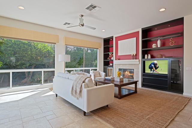 Sun City Palm Desert - San Remo. Built in 2004, this sought-after estate series San Remo model is ideally located near the Mountain View Clubhouse with its fitness center, indoor pool, driving range, tennis and pickleball courts, and hobby studios. The home sits on a spacious north-facing lot featuring an in-ground spa, built-in BBQ island with bar seating, and an expansive decorative concrete patio--perfect for entertaining or relaxing outdoors. Impressive curb appeal begins with a towering foyer, leaded glass double doors, gated courtyard, and decorative concrete hardscape. Inside, tile flooring runs throughout all but the bedrooms, and the great room showcases a dramatic 14-foot vaulted ceiling. Elsewhere, 10-foot ceilings create a light, open feel. The family room offers a gas fireplace with tile surround and a custom media center. The chef's kitchen boasts stainless steel appliances, including a Wolf cooktop, granite counters and backsplash, pendant and under-cabinet lighting, pantry, and 36-inch cabinetry. The primary suite includes a bay window, large walk-in closet with mirrored doors, and a bathroom with dual sinks, glass-enclosed shower, and oversized soaking tub. The guest wing, located on the opposite side of the home, offers two bedrooms and a full bath for added privacy. Additional features include a utility room off the garage, and a garage with epoxy floor, utility sink, overhead storage rack, and its own A/C unit.