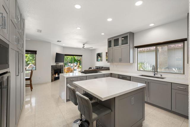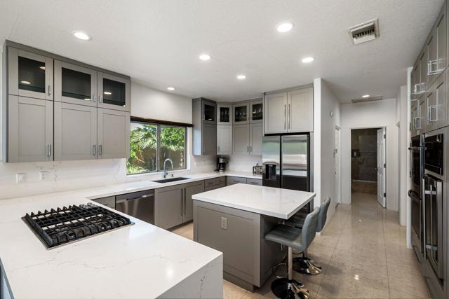 Custom designed gated 3 car garage home!!!Gorgeous remodeled kitchen and Primary Bath! Living Room, Formal Dining Room, Foyer, Great Room, Family Room, Casual Dining Room, Kitchen, Laundry Room, 3 Bedrooms (2 are matching primary suites) and 3 Full Bathrooms! Dramatic waterfall pool and spa! Living room/Dining Room have 12-foot ceilings, all the other rooms have 9-foot ceilings. Washer, Dryer, Counter-depth Frig, Gas Cook-top (w/ down-draft), Dishwasher, built-in Full-size Double Ovens, Built-in Beverage/Wine Frig and Built-in Microwave Oven. Kitchen remodel (2022). Italian Stainless-steel sink. Chrome Faucet. High-end Decorator solid chrome handles in kitchen, all 3 bathrooms, laundry room and closet. This subdivision is private and quiet, no through streets. No HOA! This home is great for entertaining. Living/dining room opens to the great room which opens to the yard/pool. open concept kitchen, family room, casual dining. Outdoor entertaining is ready with built in BBQ, large yard pool and spa, Fireplace (gas) and patio off of primary suite. Great family home or vacation home. Owned Solar.