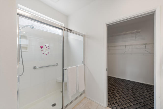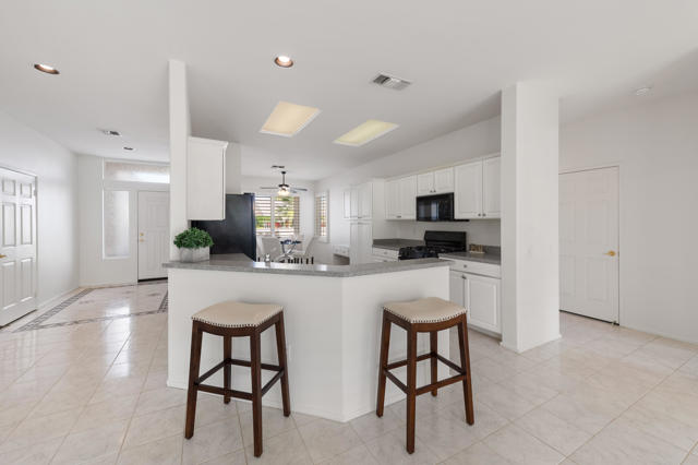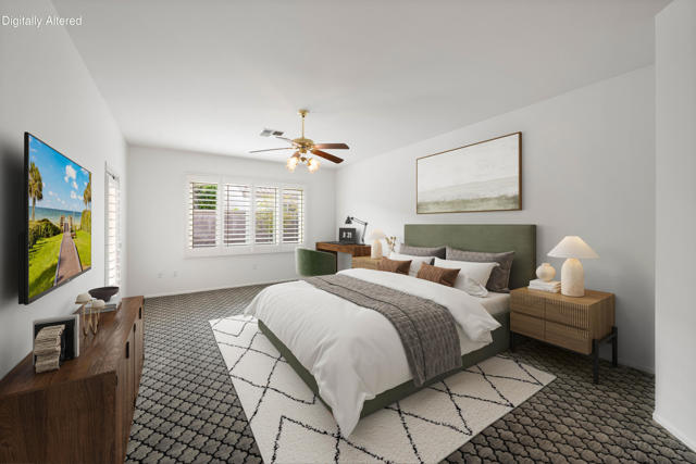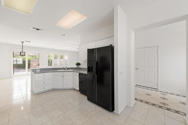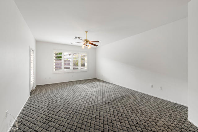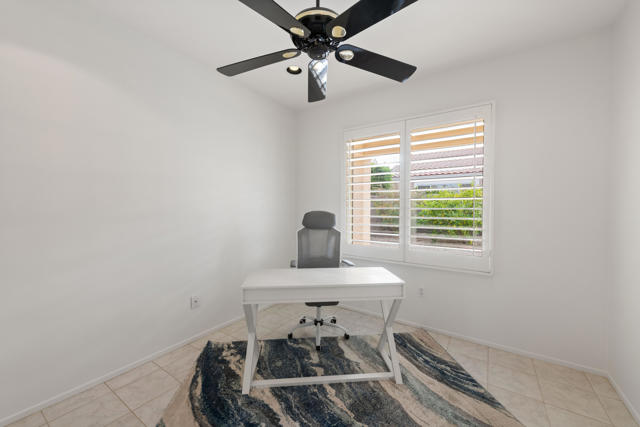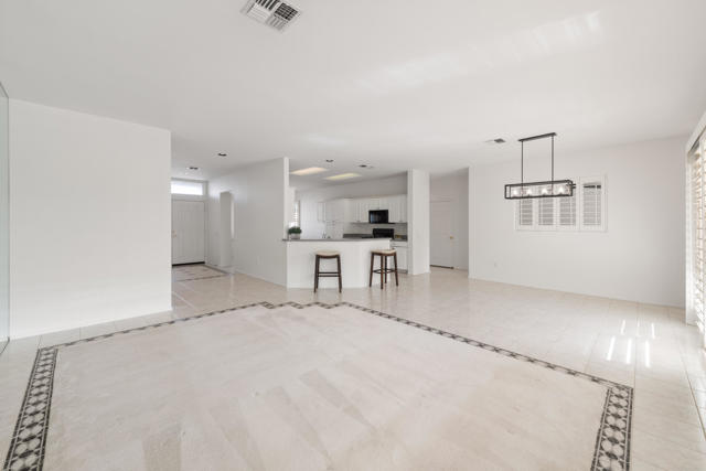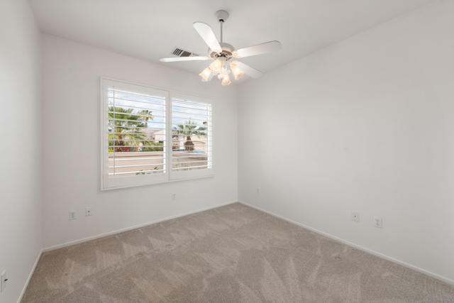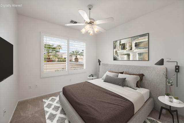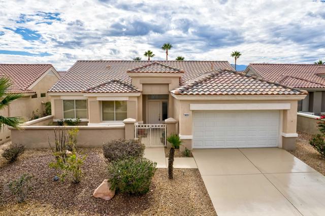 Sun City Palm Desert popular great room Montego floor plan shows pride of ownership and has been meticulously maintained. Most Desirable south facing backyard with 1858 sq.Ft. of living space, 2 bedrooms, 2 full baths, plus den or convertible bedroom. Kitchen is spacious with an eating area, upgraded kitchen cabinets, pull out shelves, brushed nickel pulls and desk and matching black appliances. Separate laundry room & 2 car attached garage is fully lined with storage cabinets. The extended primary suite has a French door leading to patio, a step-in shower, double cultured marble vanity and large walk-in closet . The guest bedroom & full bathroom are on the opposite side of the home for privacy. This home has a lot to offer with fresh paint and plantation shutters through-out, custom lighting, lighted ceiling fans, beveled mirror wall, custom tile w/entry medallion design, custom carpet borders and separate dinning area. 2 car garage has Epoxy floors and lined with storage cabinets. Private gated courtyard, and all concrete walk-ways have epoxy, desert landscaping and Sedona rock water fall in rear yard, covered patio so you can enjoy evening dinners or morning coffee. Gated front courtyard. Come enjoy the the Sun City Lifestyle with many clubs and activities.