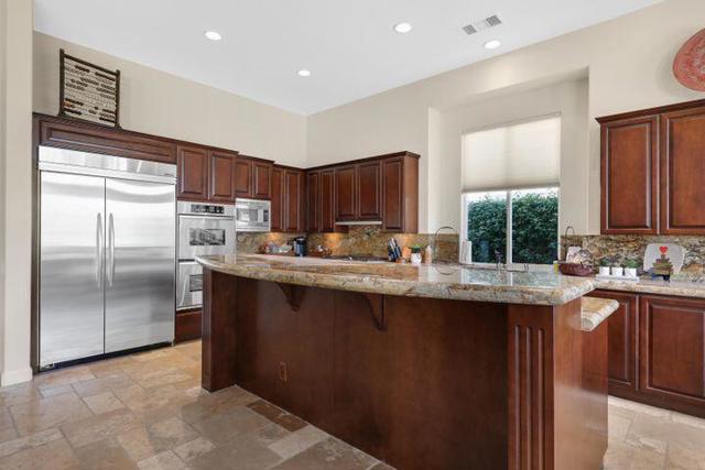 Golf Transfer available* Panoramic southern mountain views across two fairways. This dramatic, 4-bedroom Ventana home is in La Quinta's Mountain View Country Club on the Arnold Palmer Signature course. It boasts a private casita, a large private office and media room. The courtyard entry leads you into a soaring 18', skylit rotunda foyer that opens up to BIG -- a big 43' Great Room, a big 17' Office/Den, a big 35' Master Suite -- over 4400 sf. of spacious luxury. Guests?...a courtyard casita plus two guest rooms with their own sitting room (or media room or family room). The Great Room with its bow-window dining room captures the view and is perfect for entertaining. Outside the lush landscaping and custom pool extend the entertaining and frame the view. The feature list is endless - dramatic 12' soffited ceilings, 8' doors, gourmet kitchen with European-style maple cabinets, slab granite counters, convection oven and built-in refrigerator; Roman tub and separate shower in master bath, recirculating hot water, switch-start fireplace, etc, etc, etc. The newly remodeled clubhouse hosts a wide variety of social events, dining areas and lounges. The fitness & aquatic center incorporates state-of-the-art equipment, aerobics and Pilates room, personal trainers and classes. The showers, saunas, steam rooms, saunas and whirlpool complement the day spa. Outside facilities include tennis courts, pickle ball, bocce ball and a resort-style heated pool.