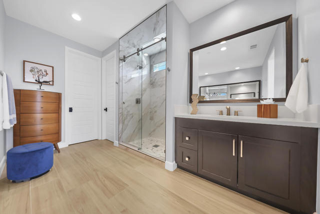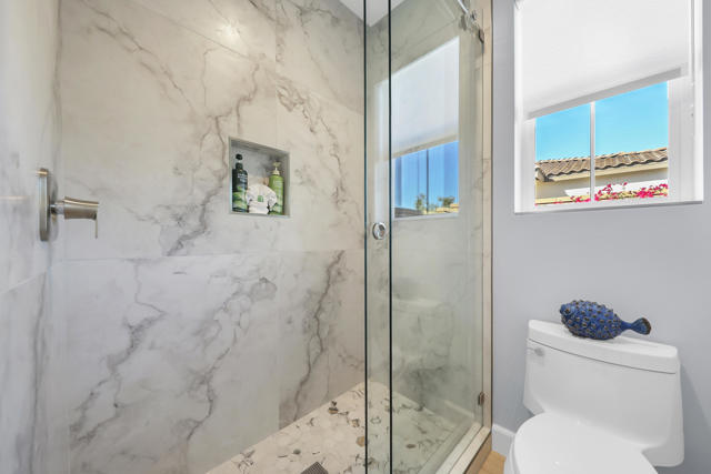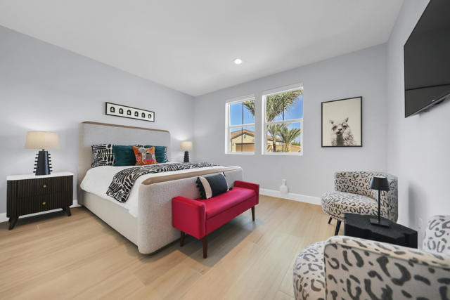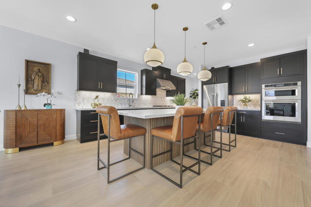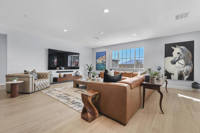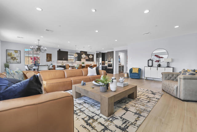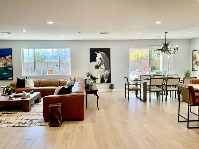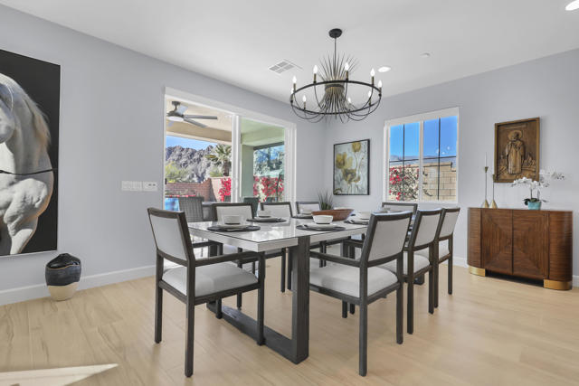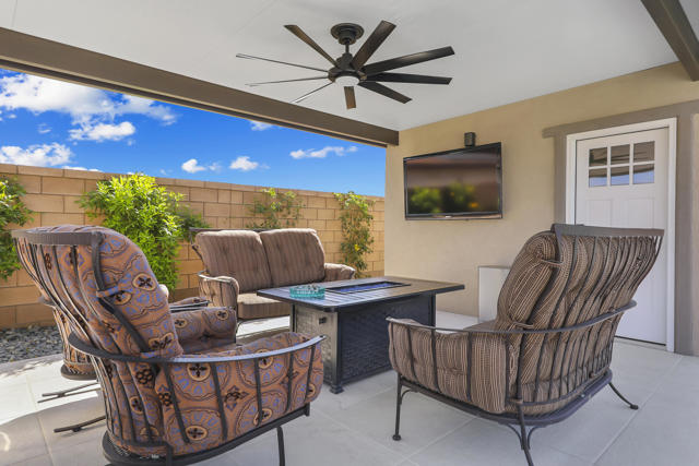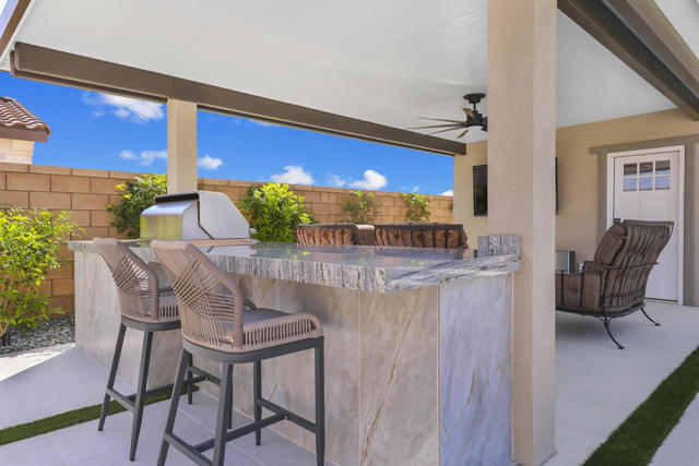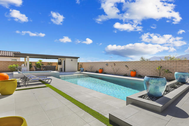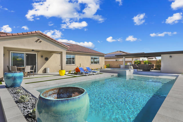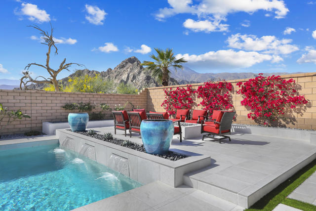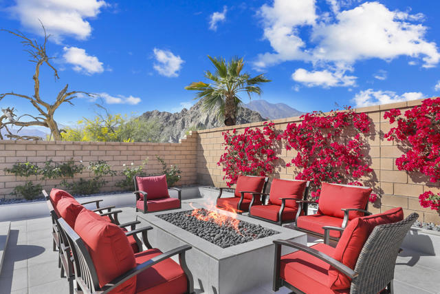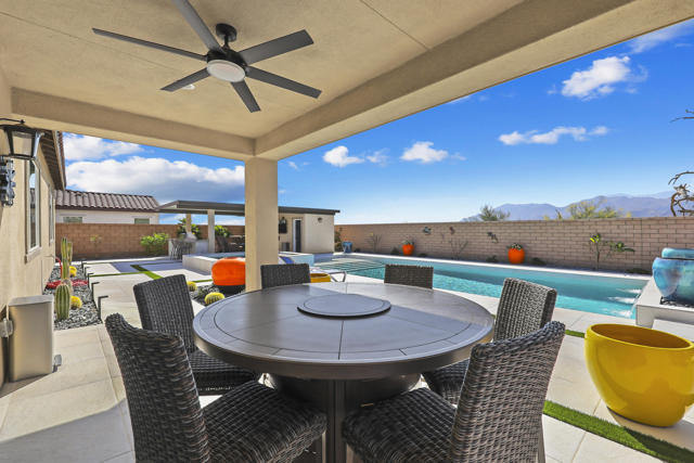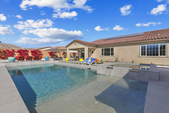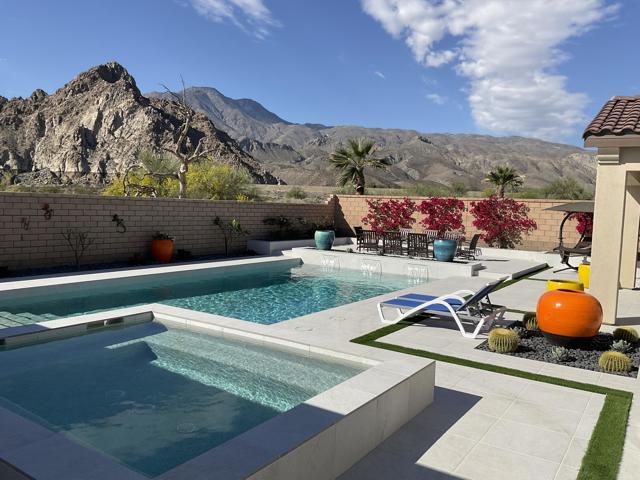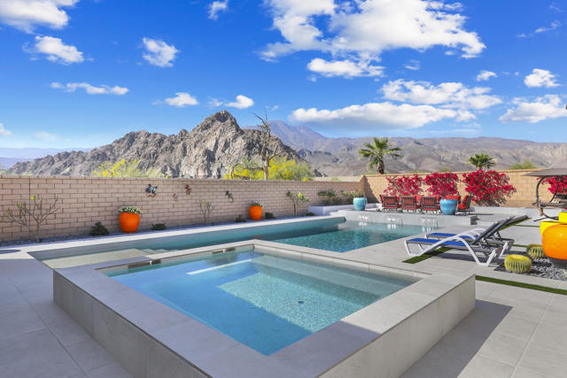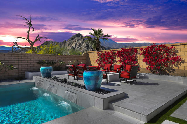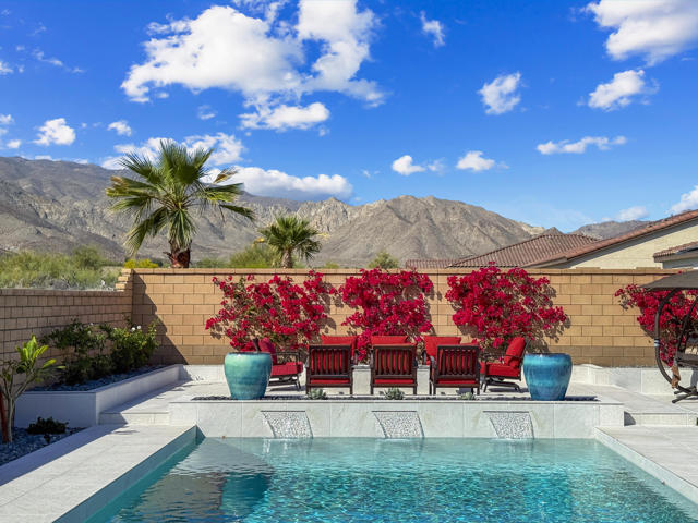 Views, Views, Views, phenomenal views of the Mountains! This 3,006 SF home on a premium lot is immaculate and has been totally upgraded from builder's grade. As soon as you enter, you will realize you are in a special home. Flooring all through has been upgraded to large porcelain tile. The doors thru-out have been heightened to 8 feet, solid 6 panel doors to create a luxurious, custom feel. Contemporary desert living nestled in the charming, gated community of Cantera at Coral Mountain.Gourmet kitchen offers built-in refrigerator, expansive island, quartz countertops and upgraded backsplash and large pendant lights. Large dining area with chandelier. The kitchen area flows seamlessly into the generously sized living area space.Features, 3 bedrooms, 3 baths and a large office space that can be converted to a fourth bedroom or additional TV room, game room, etc. Luxury awaits in the large master suite with sunrise views of the mountains. It also offers dual vanities, upgraded, porcelain shower with frameless, rolling sliding glass door and walk in closet. Two substantial bedrooms with full baths that have been upgraded with porcelain tile and frameless, rolling sliding glass shower doors, are in the front of the home offering private space for guests.The outdoors is post card perfect and is designed for maximum outdoor living and offers the best in entertainment. The extremely private, resort caliber setting, is south facing and is truly an oasis where peace, tranquility and fun come together in perfect harmony. The large (24x24) porcelain pavers throughout the outdoor space, create a clean, modern, cohesive design.The custom constructed expansive pool and oversized spa are an absolute beauty. Oversized, custom designed Gazebo creates functional outdoor relaxing, dining and entertaining with breathtaking views of the mountains. Outdoor kitchen island features upscale Alfresco Grill. Snuggle up to an ambient outdoor fire pit under the dark sky and stars.Garage floor has a beautiful epoxy finish and space for your golf cart or storage in the tandem garage with A/C. Large laundry room.OWNED SOLAR, Low HOA's and minutes away from Premium Golf Courses (PGA) restaurants, hiking, biking, Polo Grounds and Tennis Gardens. Great opportunity to own this home and start enjoying the Good Life in La Quinta!