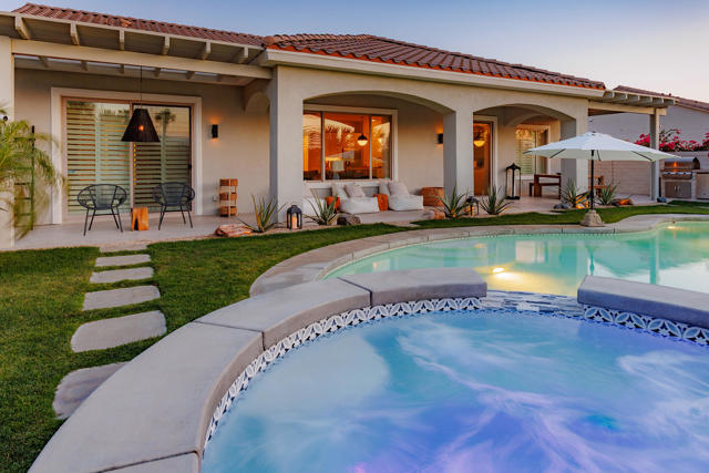 Available May- Dec for $5500.00 Ultimate desert resort style living. Located in guard gated Sun City Shadow Hills featuring the highly desirable San Rafael floor plan and adjacent to an open area on one side of property for more privacy. This totally remodeled home includes resort like pool with spa, 3 spacious bedrooms plus a den for a possible 4th bedroom and 2.5 bathrooms. The entry leads to a large great room with picture windows & sliding door to the entertainer's yard and is adjacent to the gourmet kitchen! Featuring quartzite countertops, white cabinets, all stainless steel appliances, built-in combination wall and microwave oven, refrigerator, and 5-burner gas cook top. LG steam washer & dryer in the laundry room with plenty of cabinet space & sink that leads to a 3 car garage with included golf cart. The beautiful master suite has sliding doors to the back yard with views of the pool and golf course, a large bathroom with freestanding soaking tub and separate shower and a large walk-in closet. Master has total privacy as the 2 guest suites are on the opposite side of the home and they share a Jack and Jill bath with walk-in shower. Experience outdoor living at its finest with a pool featuring a tanning shelf and an 8-foot spa. Entertain effortlessly with a built-in stainless steel BBQ and gather around the inviting gas fire pit, surrounded by a cozy, comfortable couch.