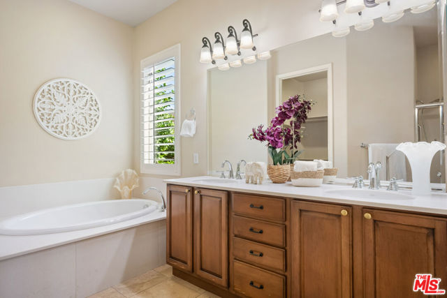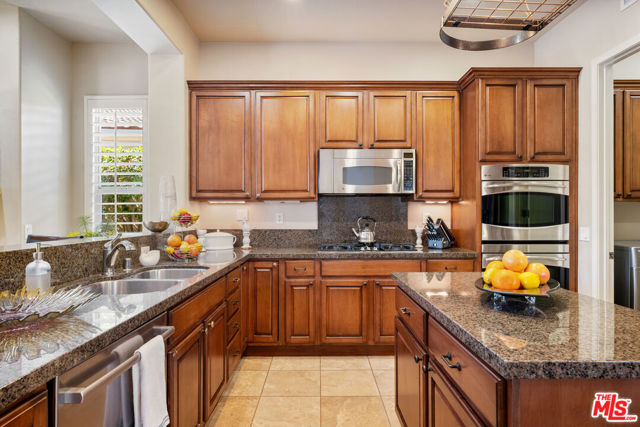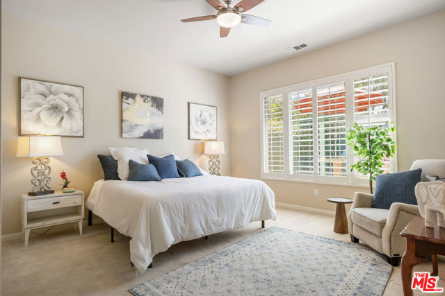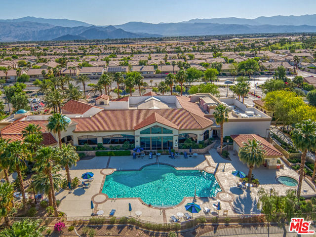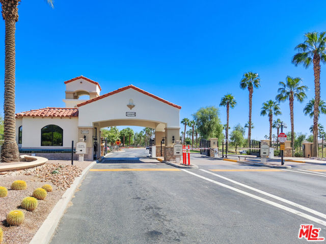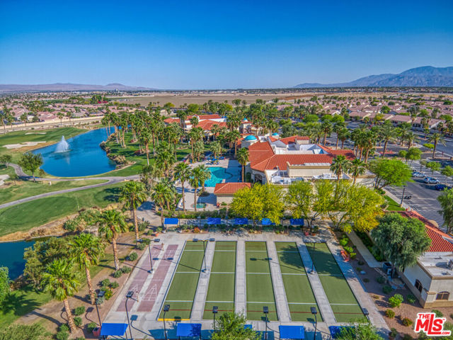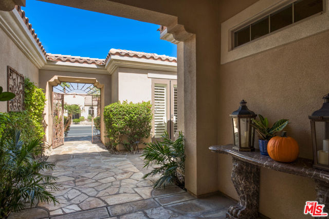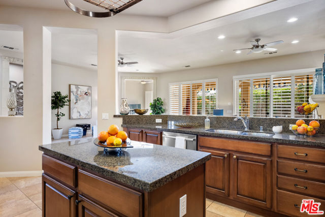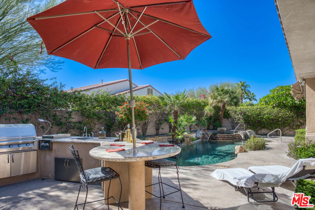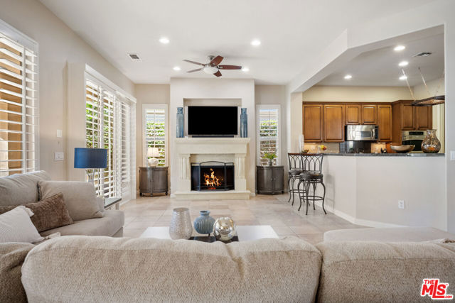 Rare and coveted Sorrano Floorplan, this spacious residence in Del Webb's Sun City Indio offers resort-style living with a stunning pool and mature landscaping including fruit trees that line the grounds with color and charm. There are 3 bedrooms + a den that can be converted to a 4th bedroom. An entertainer's dream, the home features a chef's kitchen with an oversized double oven, Bosch dishwasher, granite countertops, and a generous center island. The layout flows seamlessly from indoor spaces to the outdoors, where custom-carved stonework and a striking fireplace add warmth and elegance. A tiled, gated courtyard introduces the home and leads to a private casita complete with an en-suite bath and large closet perfect for use as a guest suite, home office, or studio. Inside, the primary suite impresses with an expansive bath, high ceilings, and wide plantation shutters throughout the home. Outdoors, the resort-style pool with waterfall and spa is joined by a gourmet kitchen equipped with an Alfresco grill, gas burners, sink, refrigerator, and a circular serving bar ideal for gatherings. A custom mechanical awning, fire pit, and multiple lounge areas complete this oasis. Designed by celebrity designer Mark Williams, the home may be sold fully furnished and appointed. Every detail reflects quality and comfort in this tranquil retreat for the discerning buyer. Located within the gated, 55+ community of Sun City Indio residents enjoy access to two clubhouses, fitness centers, two golf courses, and beautifully maintained groundsall for a low HOA fee of $369. *Furniture and Golf Cart optional.
