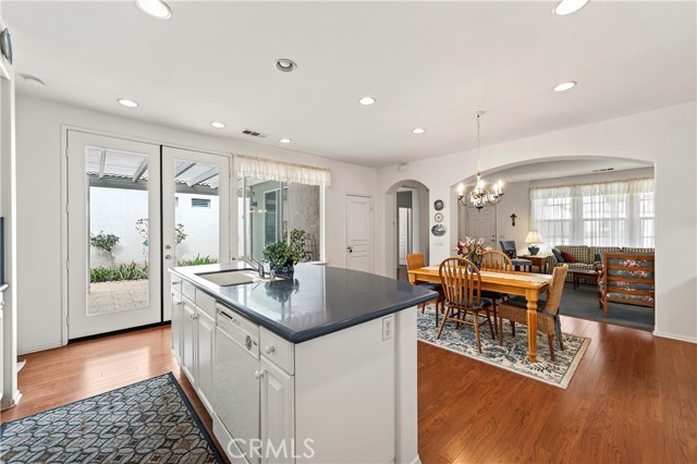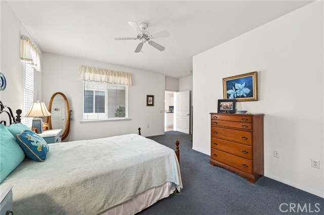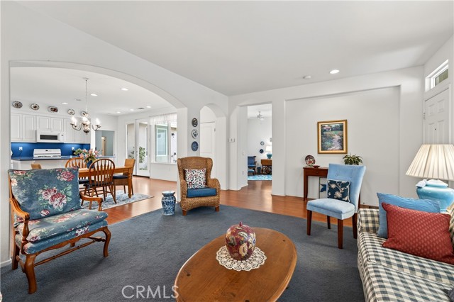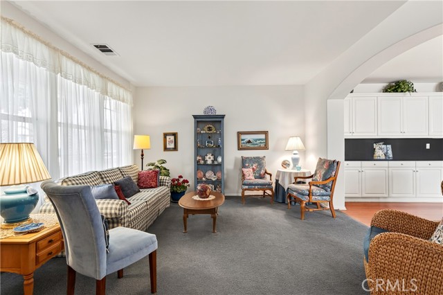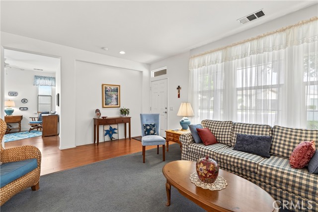 Charming home located in the 55+ fully gated, 24/7 Four Seasons community, surrounded by scenic hills and the Hemet Golf Course. Ideally situated within walking distance to the lodge and all its resort style amenities. This two bedroom, two bath home also features an office/den/craft room and boasts a spacious open floor plan with carpet and wood flooring throughout. The bright, white kitchen offers an island with bar seating, white appliances, and ample cabinet space. A wall of windows fills the living areas with natural light, while French doors open to a beautifully landscaped, covered patio, perfect for relaxing or entertaining. Additional highlights include a large masted bedroom with attached bathroom, an inside laundry room and a roomy 2-car garage. Enjoy a vibrant lifestyle with endless activities for the active senior, including tennis, pickleball, swimming pool, and spa. The community also features a beauty salon, fitness center, and a lodge offering a bistro, movie theater, computer room, craft room, billiards, ballroom, and so much more