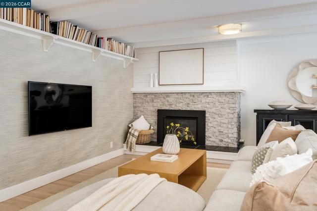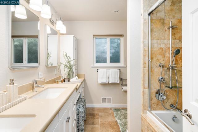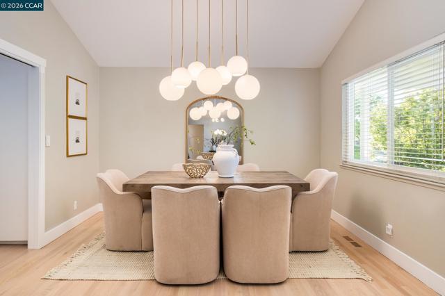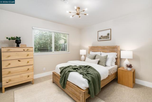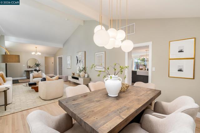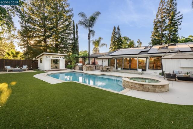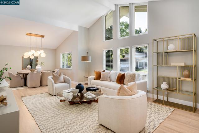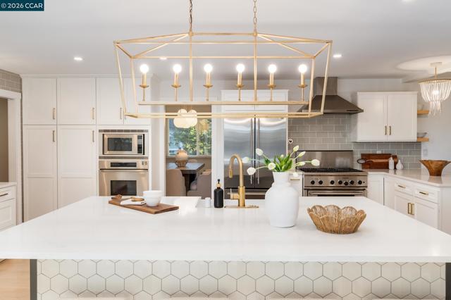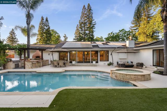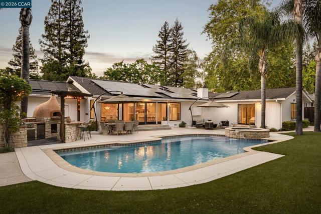 Welcome to this beautifully updated, highly sought after single-level home on a .34 acre lot in the Woodmont neighborhood of Danville. This home showcases hardwood floors, new carpet, fresh paint & custom light fixtures throughout. The front living & dining areas feature vaulted ceilings & abundant natural light creating an inviting ambiance, while the open-concept kitchen & family room serve as the heart of the home, a central hub for everyday living & entertaining. The kitchen is both functional & beautiful, featuring an abundance of cabinetry, quartz countertops, subway tile backsplash & Thermador & Dacor SS appliances. Large picturesque windows & sliding doors frame views of the backyard, enhancing indoor-outdoor flow. A sun-drenched nook w/built-in seating provides a stylish & functional space for casual dining. This floorplan offers excellent privacy, with 1 bed & full bath situated away from the rest, ideal for guests or a home office. Discover a flat, backyard oasis complete w/an outdoor kitchen incl BBQ grill, custom wood fired pizza oven & bar seating, sports court, saltwater pool/spa, large patios, firepit lounge & a detached shed. Within the award-winning SRV School District, walking distance to Vista Grande Elementary & easy access to the 680 freeway &dwtwn Danville.