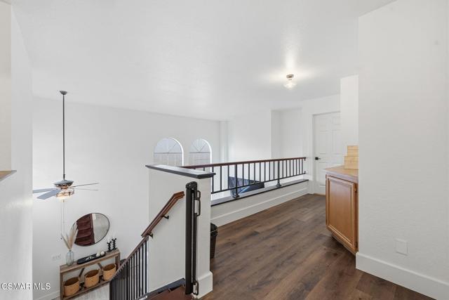 Nestled within the prestigious Fairways gated community of Wood Ranch, this beautifully updated residence offers privacy, comfort, and refined living complete with access to the community pool and spa.A charming private gated courtyard with stamped concrete patio welcomes you inside, where soaring ceilings and expansive windows fill the living room with natural light. The space is anchored by a striking custom dual-sided stacked-stone fireplace and elegant tile flooring, creating a warm yet sophisticated atmosphere. Just off the living room is a designated dining area, while the adjacent family room is currently configured as an additional dining space offering flexible living and entertaining options.The inviting family room features a brick fireplace and recessed lighting and flows seamlessly into the fully remodeled kitchen, thoughtfully designed for both everyday living and entertaining. Highlights include granite countertops, maple cabinetry, stainless steel appliances, a center island, and a sunny breakfast nook.Upstairs, wood staircases with wrought-iron banisters lead to all bedrooms. The tranquil primary suite boasts vaulted ceilings and a private balcony. Ideal for enjoying peaceful neighborhood and hillside views. The luxurious ensuite bath offers a soaking tub, separate shower, dual vanities, and a walk-in closet. Both secondary bedrooms are currently set up as office spaces and offer slight views of the Wood Ranch Golf Course.Additional features include a two-car attached garage with EV charging and a serene backyard complete with grass area, fruit trees,patio and seating area with white gravel. Perfect for outdoor dining or relaxing evenings.Situated in a quiet and private enclave, this home combines gated-community living with everyday convenience and charm.