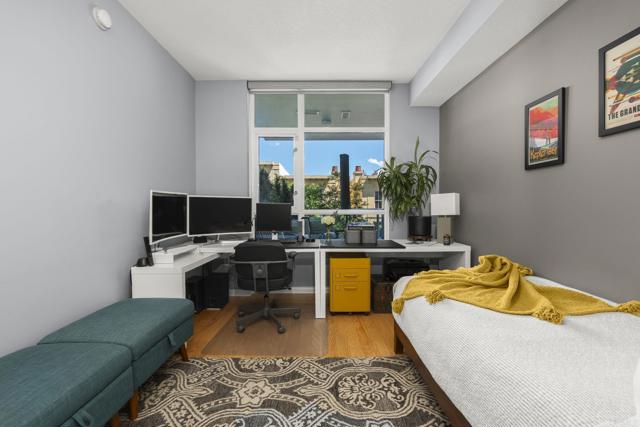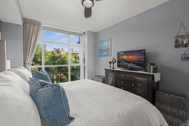 Welcome to Discovery at Cortez Hill - where sleek urban living meets luxury and tranquility. This pristine 2-bedroom, 2-bath residence in a contemporary luxury building designed for style, comfort, and convenience. With its clean modern finishes, open floor plan, and abundant natural light, this home offers a perfect balance of sophistication and livability. Relax by the cozy natural gas fireplace; roll down shades throughout, and beautiful easy care tile flooring. Step out onto your private balcony and expand your living space with an additional 108 sqft. of outdoor serenity, perched high above the treetops. Enjoy year-round natural privacy and a breezy, open-air atmosphere. In spring, the Jacaranda trees burst into vibrant purple, creating a breathtaking backdrop to your peaceful retreat. The chef-inspired kitchen with sleek granite countertops flows seamlessly into the living and dining areas, creating an inviting space for both everyday living and entertaining. The spacious primary suite feels like a private retreat, enhanced by top-of-the-line custom blackout shades, for the ultimate night’s rest. Add in the spa-inspired bath and generous closet space for pure indulgence. The second bedroom is versatile and can be used as a guest room, home office, a creative space, or den; tailored to your lifestyle. The guest bath features custom-tiled stall shower and granite countertop. A full size stacked washer and dryer are included. Residents enjoy 24-hour security and access to an array of high-end amenities, including the 10th floor rooftop heated lap pool & spa with sweeping panoramic views, a BBQ area with resort style seating and 2 fire-pits. A state-of-the-art fitness center with weight room, cardio, steam room and sauna plus thoughtfully designed communal space to unwind or socialize. A concierge service is available to accept your packages and securely store them in the on-site storage room. Plus, there’s a bike room for those who enjoy cycling. Included are one deeded parking space in the gated underground garage and an individual storage unit. Located in one of downtown’s quietest neighborhoods, Discovery at Cortez Hill is just steps away from Little Italy, Petco Park, Gaslamp Quarter, and Balboa Park. With I-5 freeway and 163 access only 3 blocks away, and travel to the airport in under 15 minutes, this is city living at its finest. Make this chic condo your urban oasis.