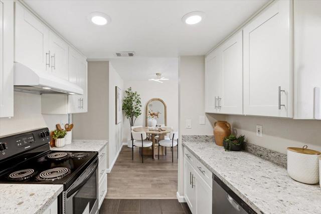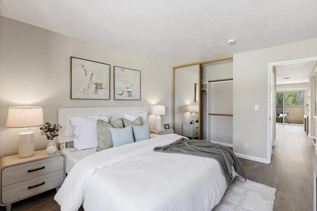 Welcome to this well maintained top floor 2 bedroom, 1.5 bath home tucked inside a quiet location within the community in the heart of Sunnyvale. Offering approximately 785 sqft of living space, it combines convenience with a bright and inviting atmosphere. The home features SPC flooring and abundant natural light throughout. The living room flows seamlessly into the dining area, creating a functional layout ideal for both everyday living and casual gatherings. The kitchen is equipped with customized cabinetry, granite countertops, and SS appliances, offering both style and practicality. It includes two spacious bedrooms along with a full bathroom and a half bathroom, providing comfortable living spaces. A large private balcony offers a relaxing outdoor area, perfect for enjoying fresh air. Both bathrooms have been updated with modern mirrors and vanity lighting. Additional improvements include a new water heater and furnace installed in 2020, adding comfort and energy efficiency. Conveniently located minutes from Downtown Sunnyvale, Caltrain, major freeways (101, 237), and major tech campuses including Apple, Nvidia and Google, it offers excellent access to shopping, dining, and parks. The HOA covers water, garbage, earthquake insurance, and other community maintenance.