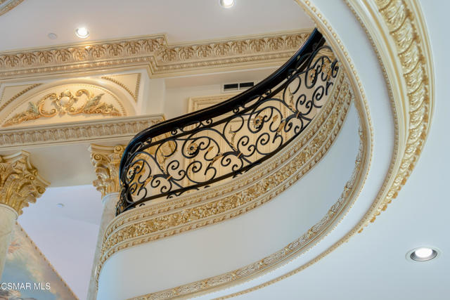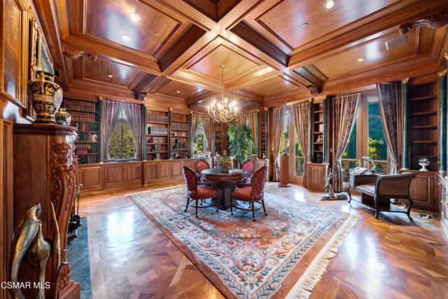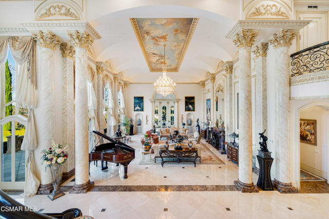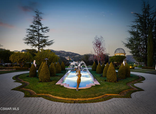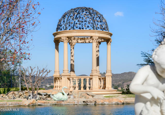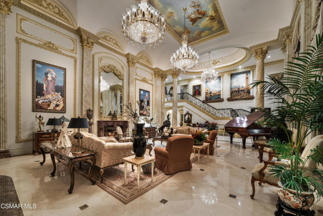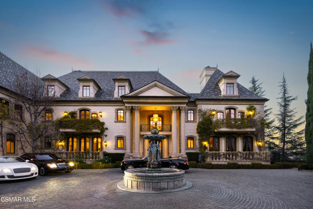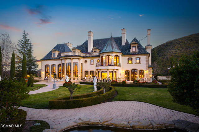 As featured in Robb Report & Los Angeles Times, Chateau Plaisance, a CASTLE nestled within the prestigious 24/7 guard gated Sherwood Country Club, spans nearly 3 private acres across 5 lots, offering breathtaking views of the spectacular Santa Monica Mountains and the renowned Jack Nicklaus Signature Golf Course. Perfected in every detail, this approx. 14,113-square-foot French-inspired masterpiece showcases unparalleled artisanship and timeless elegance.The Castle's park-like grounds are a true masterpiece, featuring formal box-hedged gardens filled with thousands of roses, lush lawns adorned with life-sized statuary, and cobblestone pathways leading to a striking 52-foot reflection pond where bronze horses appear to gallop through cascading water. A serene large infinity pool and spa with a waterfall, a koi pond, and an ornate iron gazebo overlooking the valley complete this enchanting outdoor retreat.A grand entrance welcomes you into the rotunda, where a dazzling Baccarat chandelier, hand-painted murals, and a sweeping marble staircase with a gold-leafed iron banister set the tone for the opulence within. The 22-foot-high Grand Salon & Ballroom boasts two Spanish brass and crystal chandeliers, a carved fireplace, and towering windows that frame the gardens. An elevated alcove provides the perfect stage for entertainment.The richly paneled library, complete with parquet flooring, a fireplace, and a hidden bar, offers a cozy escape, while the formal dining room, seating 20, is illuminated by two custom Waterford chandeliers. The gourmet kitchen, adorned with antiqued cabinetry, parquet flooring, four subzero refrigerators, and two oversized islands, opens to a warm and inviting family room featuring a grand fireplace, elegant window seating, and a granite-topped bar.The second floor offers a luxurious primary suite with a sitting area, fireplace, a sleek wet bar, and two lavish spa-inspired baths with oversized closets. Additional guest suites, a Carriage House apartment, and a hidden third-floor bonus space provide ample accommodations. The completed third floor features four separate rooms, providing endless possibilities for a home theater, gym, art studio, or private retreat.This Castle also includes a Pool House--a Mini Chateau with a great room, grand fireplace, kitchen, and two bathrooms, perfect for poolside entertaining. Two gated entrances lead to an elegant courtyard with an imported French fountain, while a separate guest parking area and the Grand Plaza can accommodate up to 150 guests.Gated guest parking is conveniently located near the charming greenhouse and the elegant archway leading to the Grand Plaza, designed to accommodate approximately 150 guests with ease. Chateau Plaisance Castle stands as a pinnacle of luxury, privacy, and grandeur--an estate unlike any other to ever grace the market.