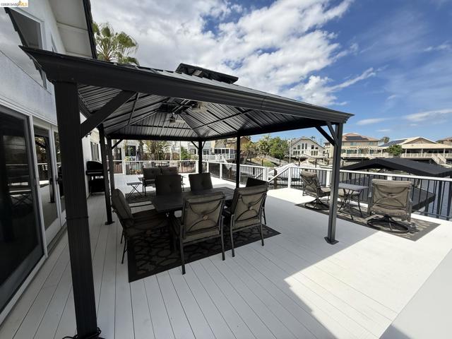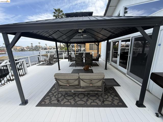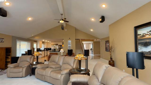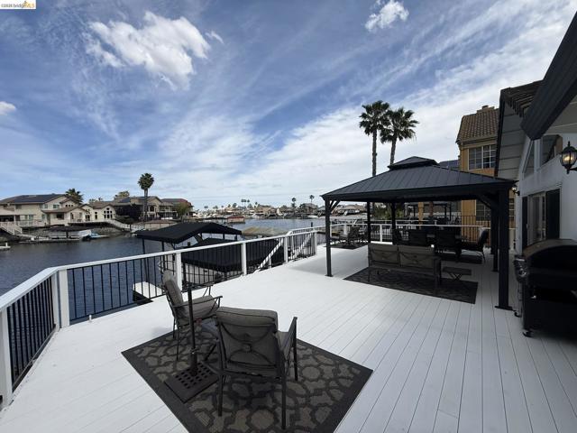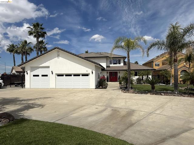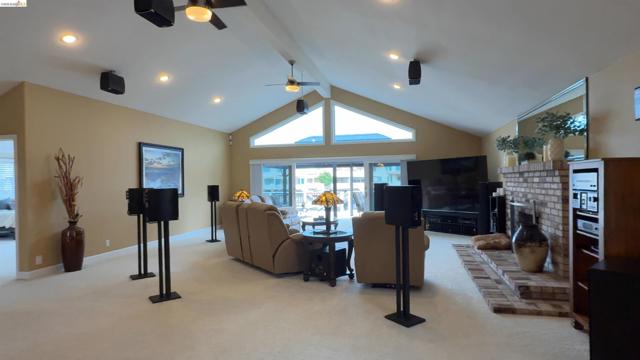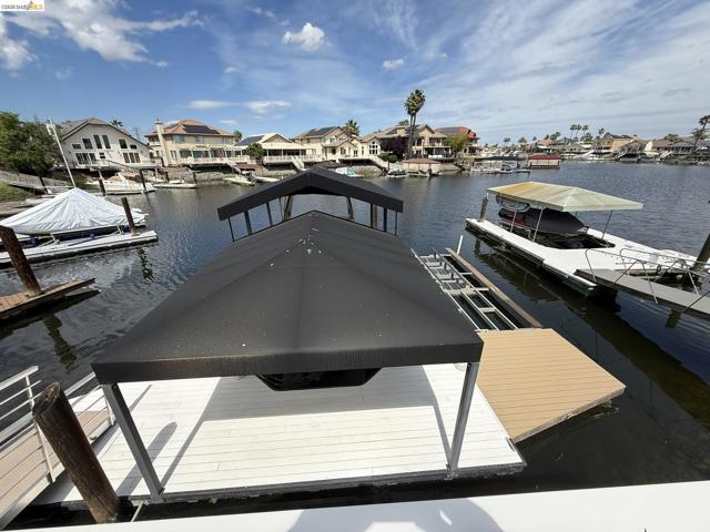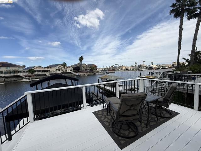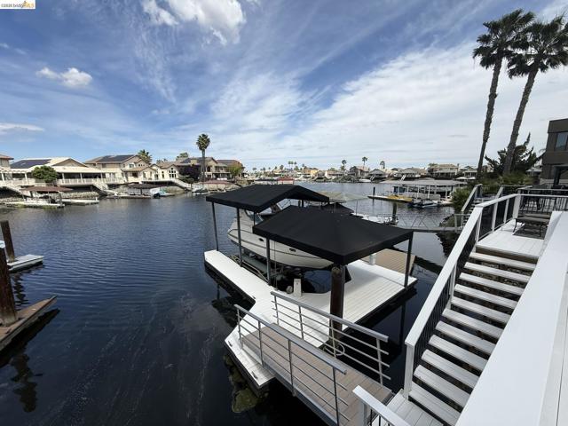 Welcome to your Delta waterfront escape—this custom 4,689 sq ft home sits on a large corner lot with an impressive “U”-shaped driveway and offers a private dock equipped with two HydroHoists (10,000 lb & 7,500 lb). With direct access to over 1,100 miles of waterways leading to the San Francisco Bay, this is boating at its best. Ask about the boat for sale. Inside, a marble style ceramic floor in the foyer opens to a light-filled open floorplan with soaring ceilings. The kitchen shines with stainless steel appliances and abundant cabinetry, while the great room delivers an immersive entertainment experience with a professional-grade 11.1 channel Dolby Atmos surround sound system (available for purchase). The downstairs primary suite (~725 sq ft) offers a private retreat, complemented by a formal dining room and a versatile bonus room (potential 4th bedroom). Step outside to a large deck framed by lush landscaping—perfect for waterfront entertaining. The oversized 4-car shop-style garage (~930 sq ft, ~29’ x 32’) with 10’6” ceilings and a 10’ x 10’ RV door is ideal for boats, vehicles, or hobbies, plus side yard trailer storage. A rare opportunity to own a true Delta waterfront entertainer’s dream.