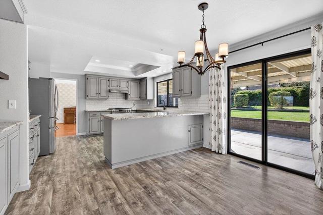 Discover a beautifully appointed home in the gated community of Ridgemark Golf Course offering a spacious 2,400 sq ft of living space on a generous lot size of approximately 13,939 sq ft. This well-designed residence includes three bedrooms and two full bathrooms and a 1/2 bath, featuring a shower and tub, as well as a stall shower. The heart of the home is the modern kitchen, equipped with a granite countertop, dishwasher, garbage disposal, and a built-in gas oven range, ideal for culinary enthusiasts. The formal dining room and separate family room, both with open beam and vaulted ceilings, provide ample space for entertaining and relaxation. For your comfort, the home includes central AC and central forced air - gas heating. The cozy fireplace adds warmth and charm to the living space. The interior features quality flooring throughout, with laundry conveniently located inside, offering electricity hookup (220V). The backyard has a covered patio looking out to large lawn area and fruit trees, orange, lemon and lime. With a two-car garage and an existing shed, storage will never be an issue. Enjoy the perfect blend of style, space, and functionality in this Hollister gem.